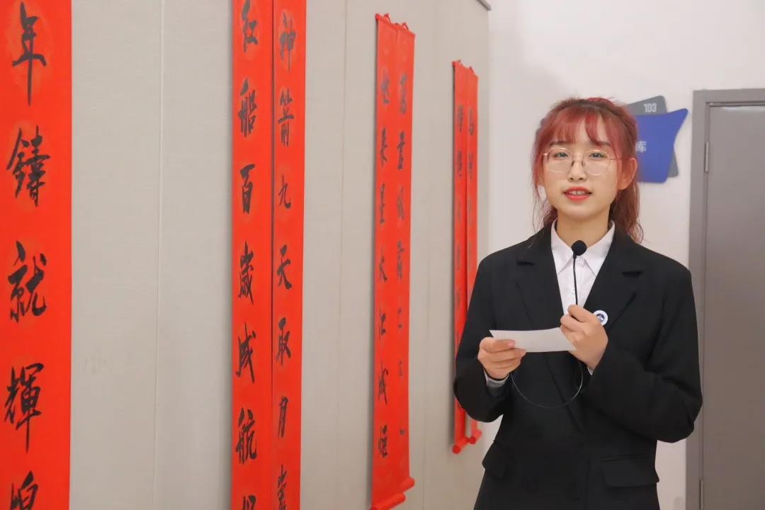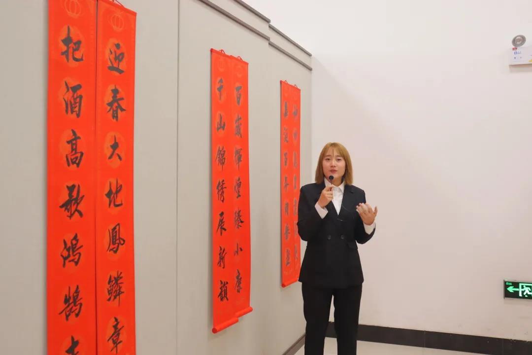與此同時進(jìn)行第二項由圖書館的侯進(jìn)、曲婧、馬瑞英三位老師分別為同學(xué)們講解楹聯(lián)“山河共吟英雄曲,華夏齊唱圓夢歌”和“一路香風(fēng)尤醉我,百年大夢更生津”以及“歲月逢春花遍地,人民有黨志登天”。