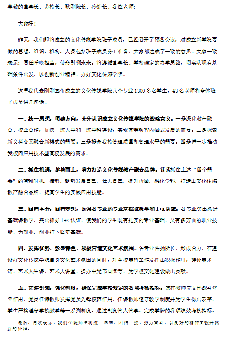 在此恭賀文化傳媒學院的成立,愿全院師生統(tǒng)一思想,團結一致,努力奮斗,以良好的精神面貌迎