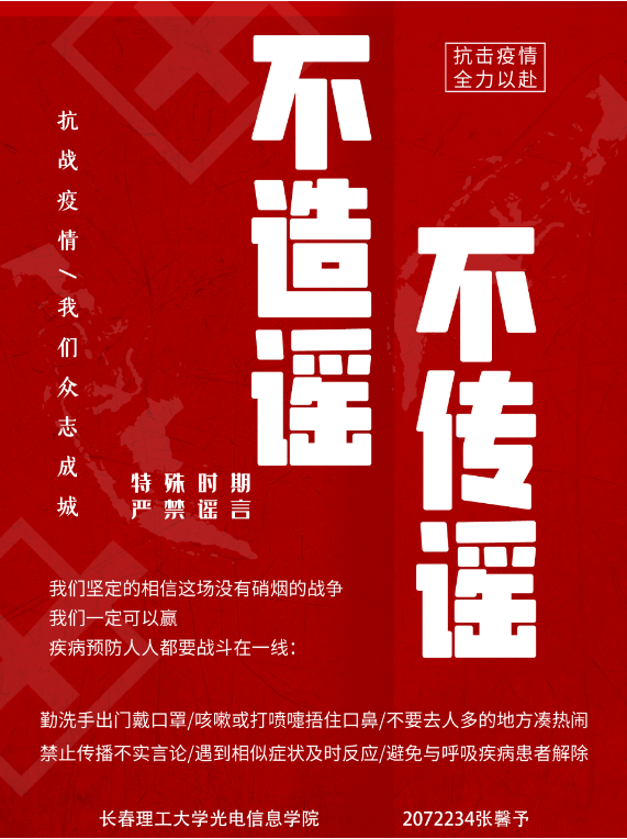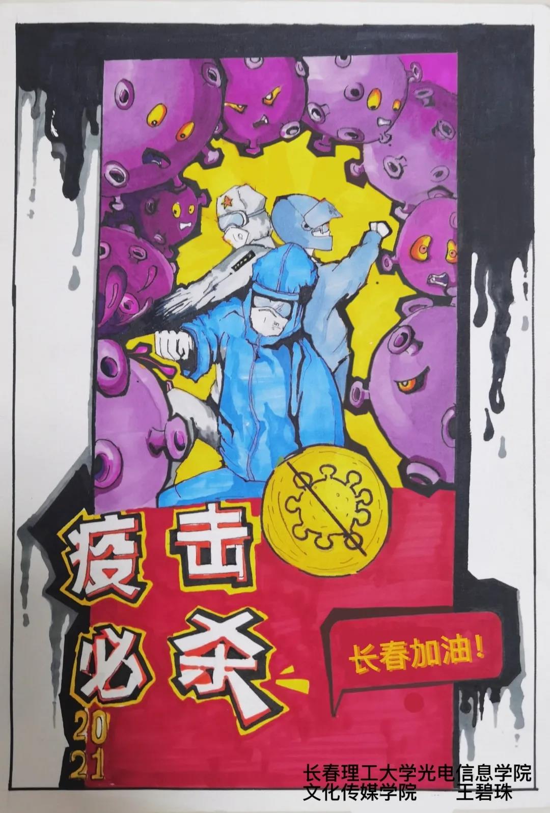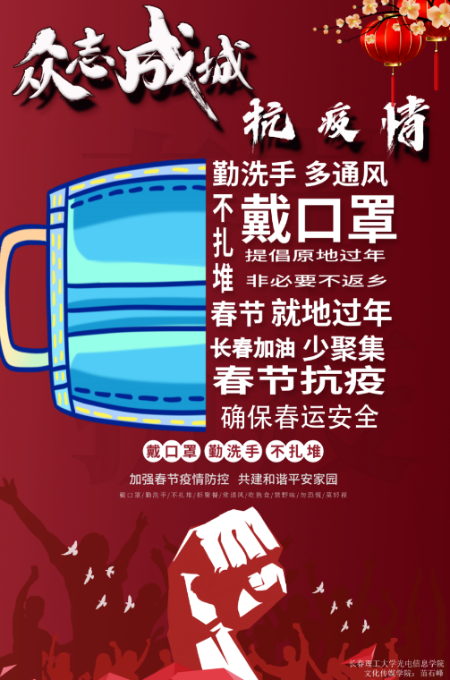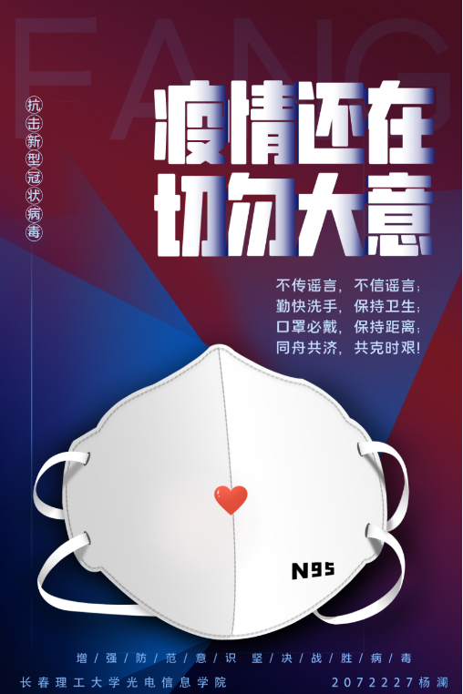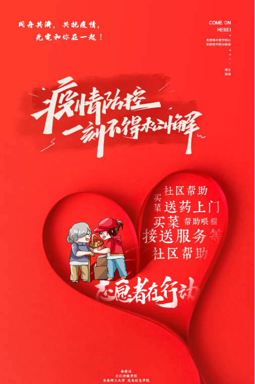 從最開始對新冠疫情的猝不及防,到全民抗疫的眾志成城、共克時艱,再到實(shí)現(xiàn)疫情防控常態(tài)化,我們每一個人都為抗擊疫情貢獻(xiàn)了自己的一份小小的力量。近日我院的大學(xué)生志愿者分布在全國各地的5個省份,22個市,29個區(qū)參加抗疫志愿者服務(wù),為家鄉(xiāng)抗疫付出辛苦奉獻(xiàn)愛心。為了實(shí)現(xiàn)早日戰(zhàn)勝疫情的心愿,長春理工大學(xué)光電信息學(xué)院文化傳媒學(xué)院舉行了原創(chuàng)抗疫海報活動,大一到大四的全體學(xué)生們充分發(fā)揮學(xué)院專業(yè)特點(diǎn),活用在學(xué)校所學(xué)習(xí)的專業(yè)知識,創(chuàng)作了共同抗疫主題電子海報和手繪海報,用自己的行動為抗疫加油,貢獻(xiàn)一份綿薄之力。
