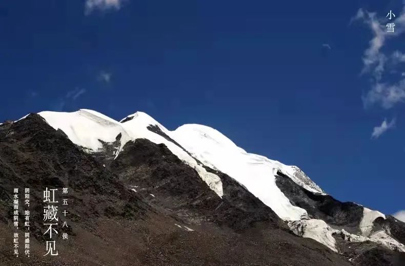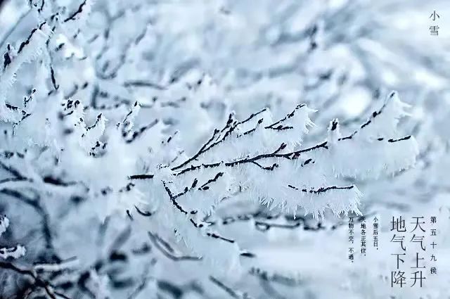 中國古人將小雪分為三候:一候虹藏不見;二候天氣上升地氣下降;三候閉塞而成冬。由于天空中的陽氣上升,地中的陰氣下降,導(dǎo)致天地不通,陰陽不交,所以萬物失去生機(jī),天地閉塞而轉(zhuǎn)入嚴(yán)寒的冬天。