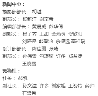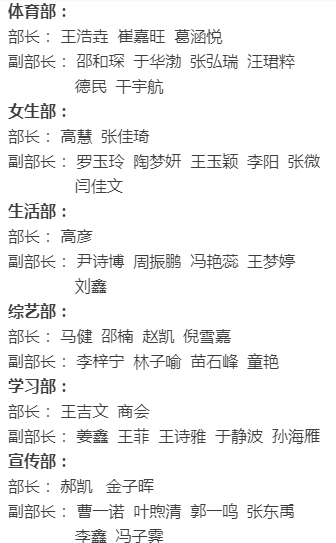 大會(huì)第四項(xiàng):由18級(jí)團(tuán)委副書(shū)記郭廓宣布18級(jí)學(xué)生會(huì)各部門(mén)副部長(zhǎng);