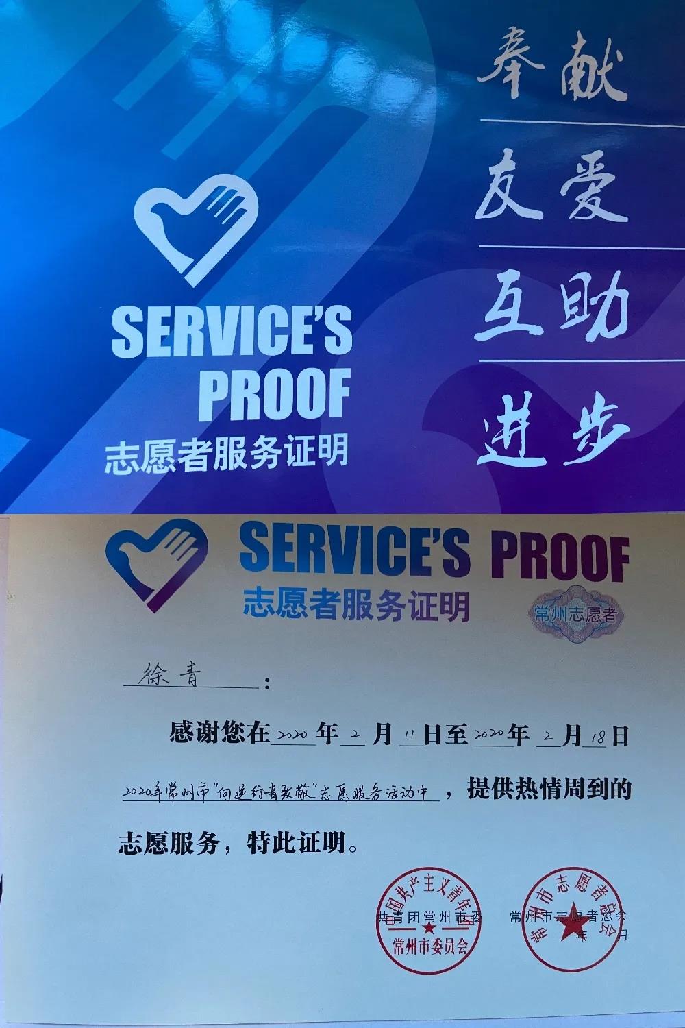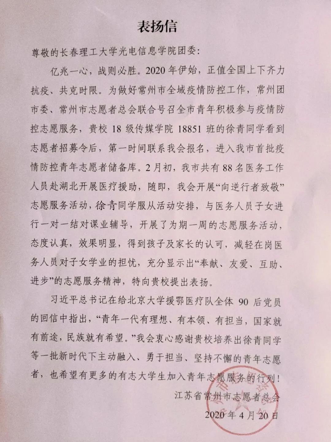 我院18級(jí)廣告專業(yè)的徐青同學(xué)更是為我們起到了榜樣的作用,江蘇省常州市志愿者總會(huì)給我院寄來了