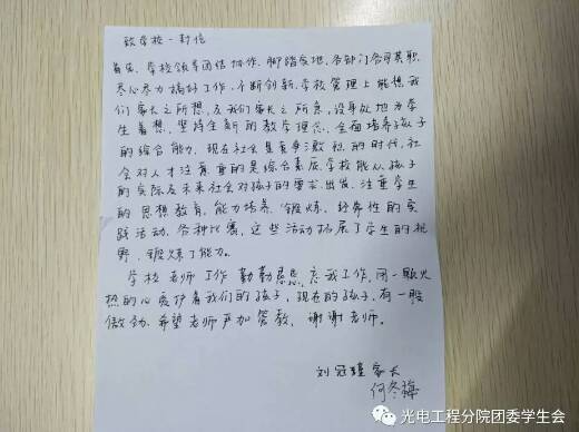 光陰荏苒,轉(zhuǎn)眼您的孩子已經(jīng)在光電信息學(xué)院度過了一個(gè)學(xué)期,您一定十分牽掛孩子的學(xué)習(xí)和生活狀況,希望他/她在大學(xué)中盡快地成長成才。希望您能和學(xué)院一起共同造就具有完善人格,能夠扎根民族、心懷天下,能夠追求卓越、視野開闊,具有科學(xué)精神、探索精神、創(chuàng)新精神和實(shí)踐動(dòng)手能力的光電人。