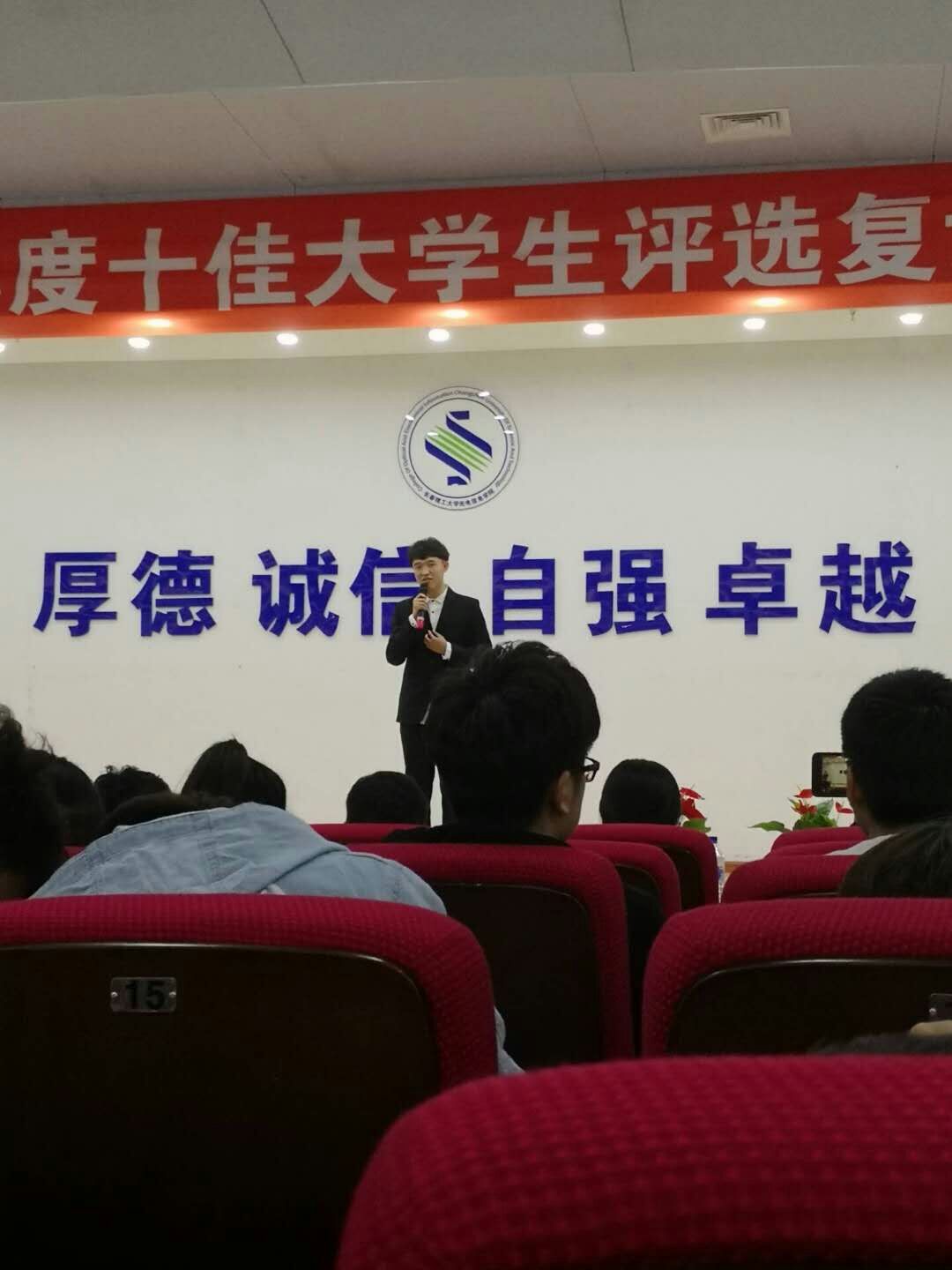 隨后,評(píng)委們根據(jù)候選人特點(diǎn)進(jìn)行有針對(duì)性的提問,各位候選人則以敏捷的思維,有條不紊地回答。本著“優(yōu)中選優(yōu)”的原則,我分院16級(jí)張文博同學(xué)獲得我院十佳大學(xué)生這一最高榮譽(yù)。