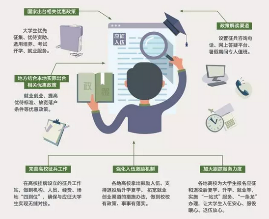 2018年年初,國防部征兵辦公室下發(fā)《關于做好2018年征兵準備工作的通知》,《通知》強調(diào),各地要嚴格落實大學生報名應征、體檢政考、審批定兵、分配去向“四優(yōu)先”政策,及早部署展開大學生預征工作,確保在大學生離校前完成體格檢查、政治考核和預定兵工作。優(yōu)先批準大學畢業(yè)生入伍,確保大學生征集數(shù)量和質量穩(wěn)步提升。