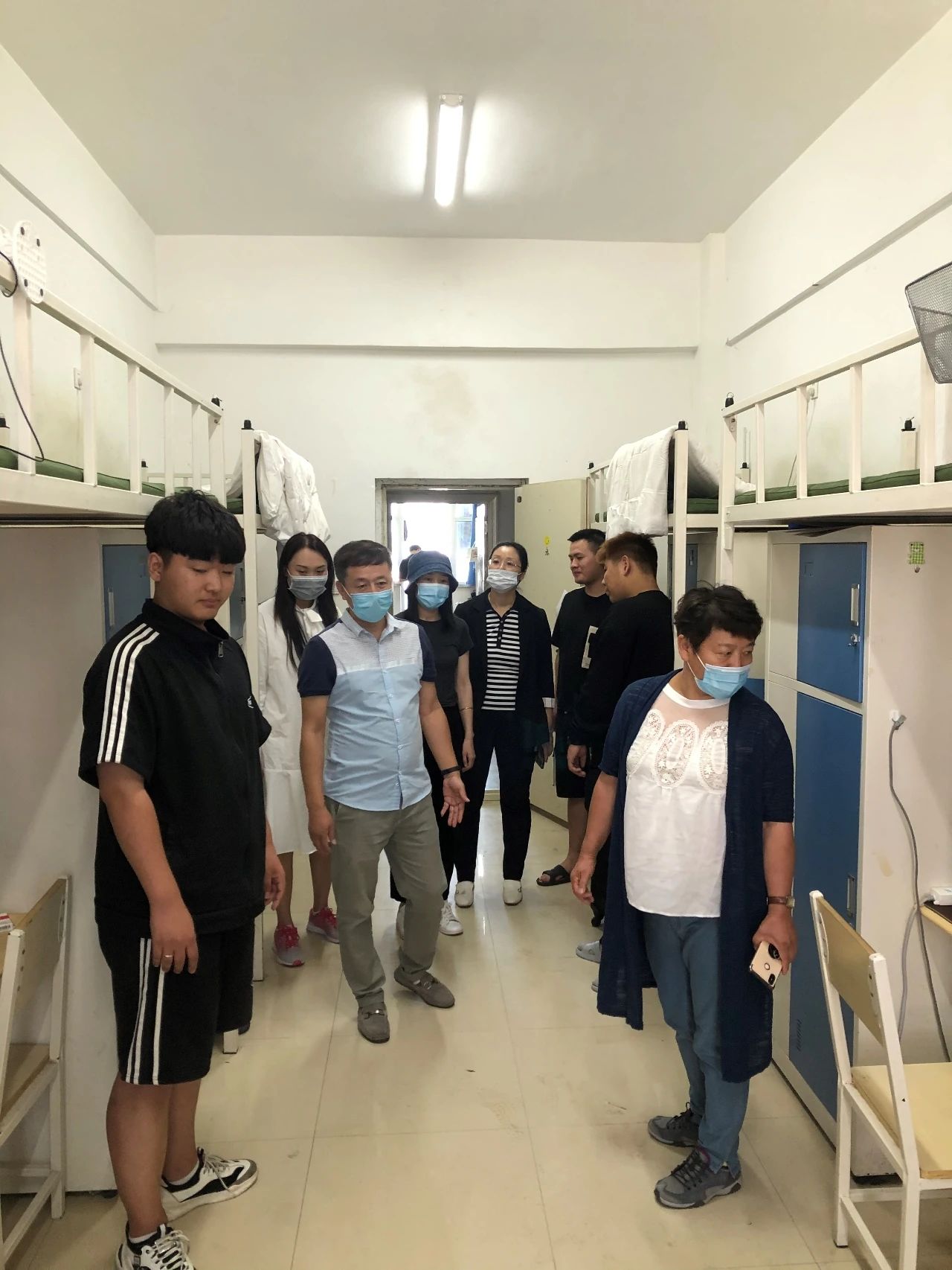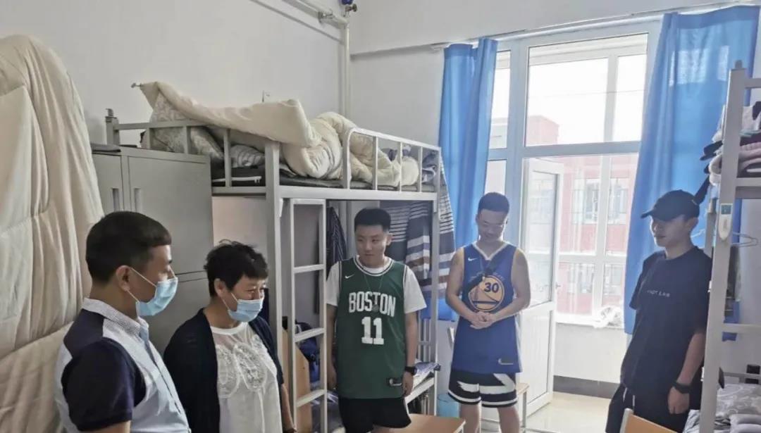 8.22日下午一點,院長孫曉冰在副院長李照明、輔導員郭影、李琢、郭麗莉的陪同下,走訪了返校學生的寢室。