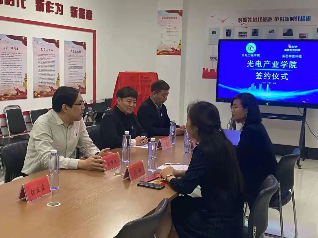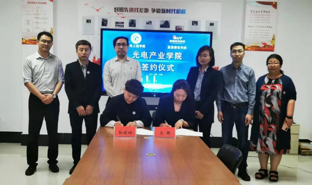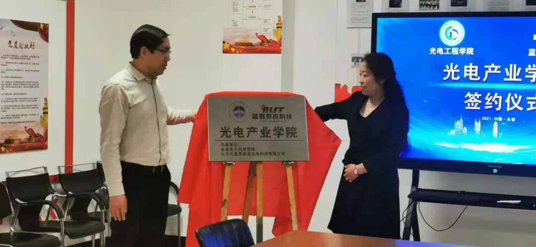 雙方簽訂協(xié)議后,共同舉行揭牌儀式,由校長助理王耀遠(yuǎn)與藍(lán)思泰克公司綜合部經(jīng)理齊娜為“光電產(chǎn)業(yè)學(xué)院”揭牌。