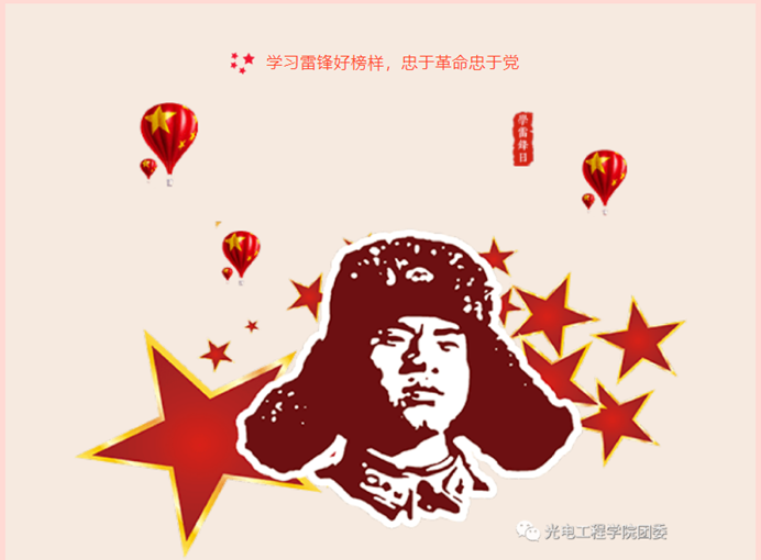 雷鋒精神是新時代的偉大旗幟,是社會主義核心價值觀的集中體現(xiàn)!光工學(xué)子重任在肩。光工學(xué)院的同學(xué)們要以學(xué)雷鋒活動為契機,積極開展對雷鋒精神的學(xué)習(xí)、實踐、總結(jié)活動,增加光工同學(xué)之間的凝聚力,把學(xué)習(xí)雷鋒精神與學(xué)校的德育工作重點,光工學(xué)生的自我教育和實際行動相結(jié)合,使學(xué)校的校園環(huán)境、光工同學(xué)們的學(xué)習(xí)風(fēng)氣和精神面貌都有一個質(zhì)的提高。讓我們攜起手來,從我做起,從身邊做起,從現(xiàn)在做起,讓雷鋒精神與我們同行,薪火相傳,發(fā)揚光大!!