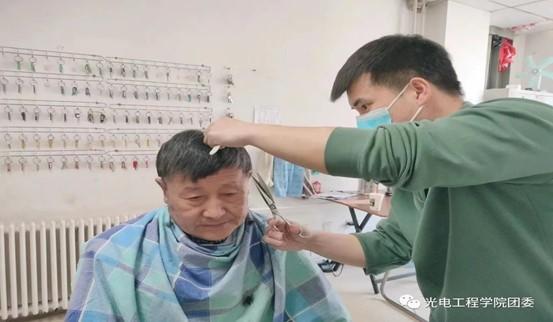 繼承雷鋒精神,弘揚優(yōu)秀品德。由光電工程學(xué)院的退伍兵組成的志愿服務(wù)團隊開展了替老人上門理發(fā)的活動,