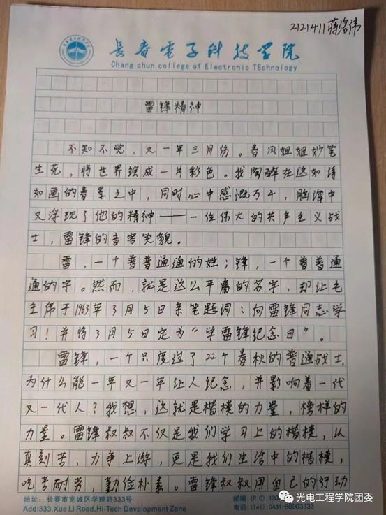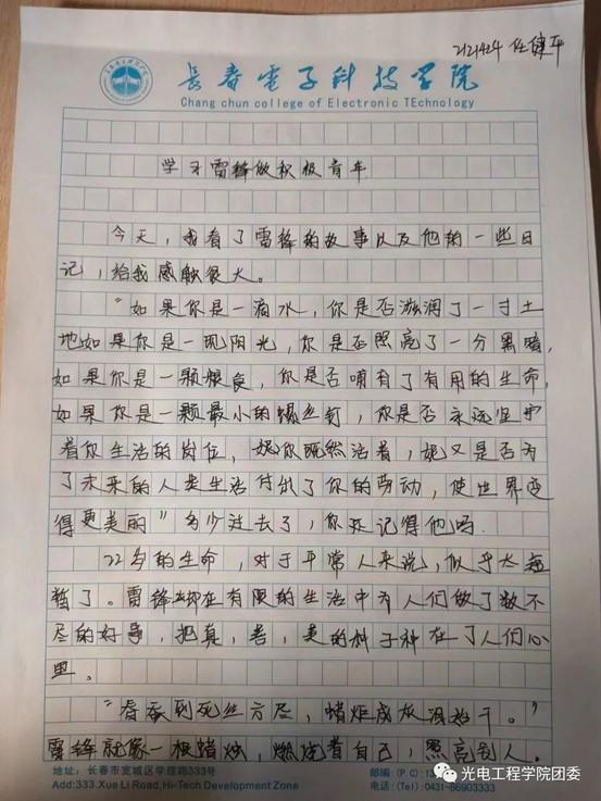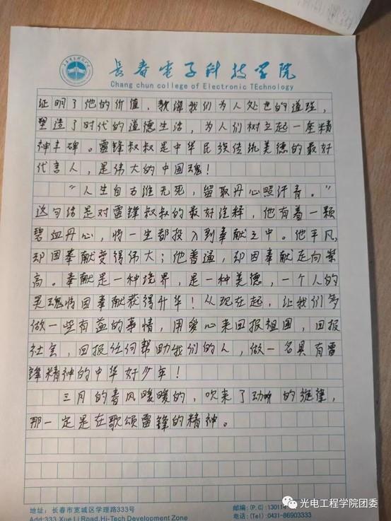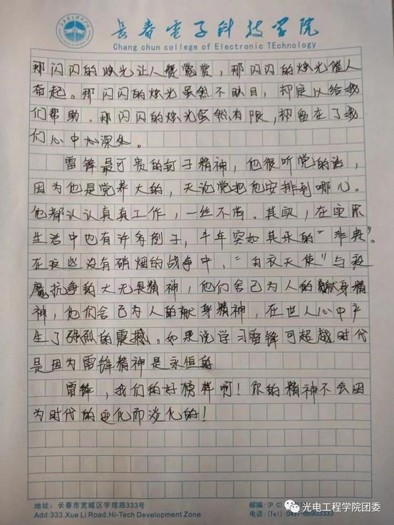 為了學(xué)習(xí)雷鋒精神,我院組織了光工學(xué)生觀看雷鋒紀錄片,來觸動光工學(xué)院的學(xué)生們的心靈,并通過寫“我心目中的雷鋒精神”的征文來紀念雷鋒同志。