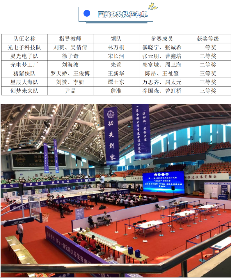 第十一屆全國(guó)大學(xué)生光電設(shè)計(jì)競(jìng)賽共設(shè)有兩個(gè)賽題,分別為“酒精濃度的非接觸測(cè)量”和“‘迷宮尋寶’光電智能小車(chē)”。本次設(shè)計(jì)競(jìng)賽實(shí)物決賽,我校共獲得國(guó)獎(jiǎng)級(jí)二等獎(jiǎng)三項(xiàng)、國(guó)家級(jí)三等獎(jiǎng)三項(xiàng),學(xué)校在諸多參賽高校中脫穎而出,喜獲優(yōu)秀組織獎(jiǎng)。獲得國(guó)家二等獎(jiǎng)的團(tuán)隊(duì)和同學(xué)分別是劉赟、吳倩倩老師指導(dǎo)的“光電子科技隊(duì)”由林萬(wàn)桐、暴曉寧、張誠(chéng)希同學(xué)組隊(duì);徐子奇老師指導(dǎo)的“靈光電子隊(duì)”由宋長(zhǎng)河、張?jiān)婆蟆⒉荟闻嗤瑢W(xué)組隊(duì);劉海波老師指導(dǎo)“光電夢(mèng)工廠隊(duì)”由朱萱、郭富城、周衛(wèi)海同學(xué)組隊(duì)。