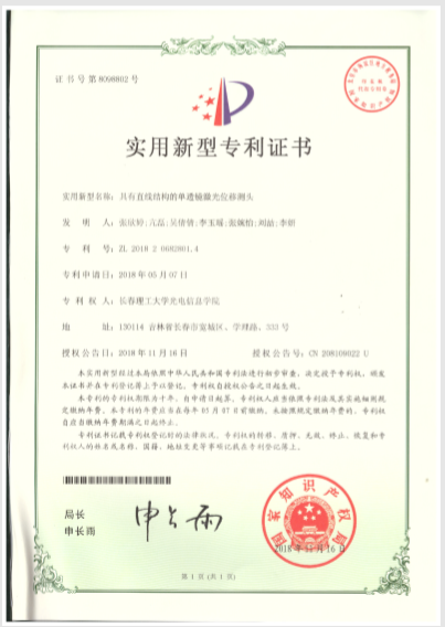 | 具有直線結構的單透鏡激光位移測頭 | 張欣婷 | 2018 | ZL 2018 2 0682801.4 | |
