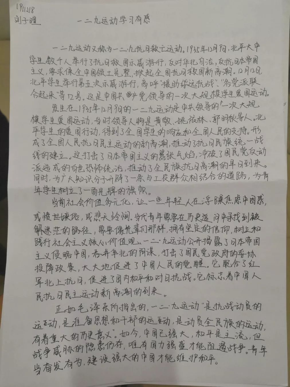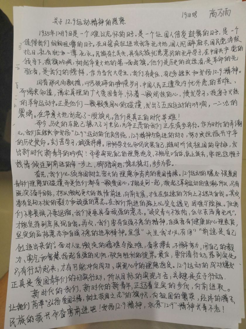 通過此次紀念“一二九運動”觀影活動,讓同學們重溫“一二九運動”這段歷史。今天,我們紀念它不僅是緬懷過去,追念先人。更是為了讓我們永遠銘記12.9這個神圣而又偉大的日子,牢記國恥,永遠不忘日本對中華民族的侵略。今天,我們的國家已非昔日的貧窮與落后的中國,我們已是一個蒸蒸日上的,日漸繁榮的,團結進步的,具有著強大的國防力量和經(jīng)濟基礎的,具有著偉大的愛國主義精神和民族精神的自立世界民族之林的國家。在中國共產(chǎn)黨領導下,我們全國各族人民正在努力建設我們偉大的國家。我們是國家未來的棟梁,祖國明天的希望,我們肩負著中華民族復興和發(fā)展的使命。讓我們踏著先輩的足跡,努力學習,用我們的智慧和雙手,把我們的祖國建設的更加強大,更加美麗,更加昌盛。