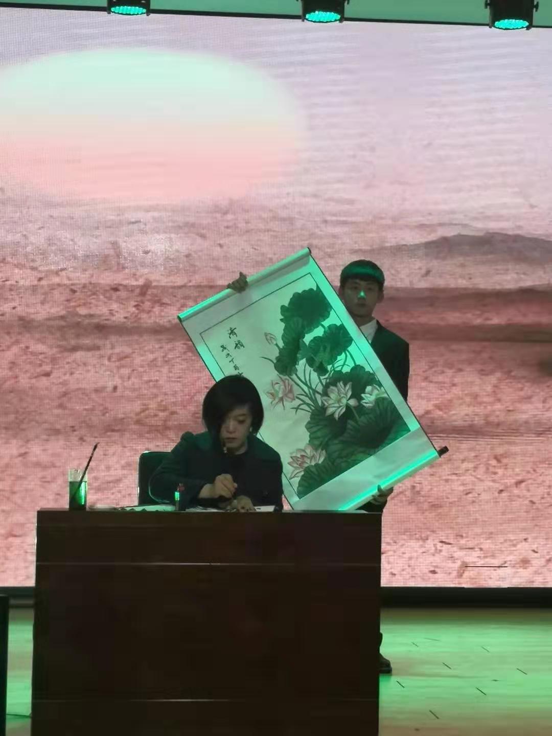 伴隨著動人的箏聲,王一如老師也登上舞臺,在扇紙上舒展著筆墨丹青,幾筆勾勒似云錦,一幅竹墨便悄然在紙上出現(xiàn).