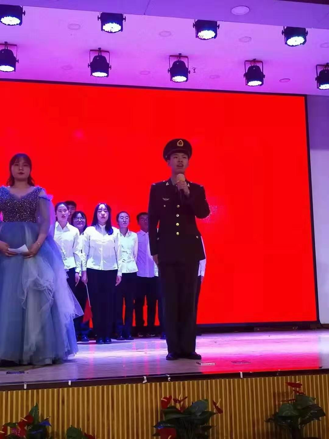 晚會最后,回歸軍人上臺獻(xiàn)上祝詞,邊家寶同學(xué)代表發(fā)言:七十年崢嶸歲月,我們的祖國日益強大,處于新時代的我們,更應(yīng)該不忘初心,牢記使命,砥礪前行。