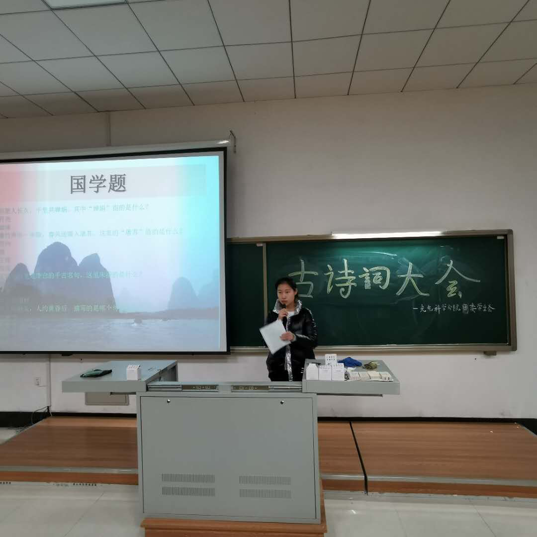 為更好的傳承詩歌文化、彰顯語言魅力、品味文化經(jīng)典,使學生可以更直接的方式體會古詩文的深刻內(nèi)涵、傳承中華文化、發(fā)揚中華文明、提高文化底蘊。光電科學學院團委學生會學習部于11月2日下午五點半在西階教室舉辦了第一屆古詩詞大會。