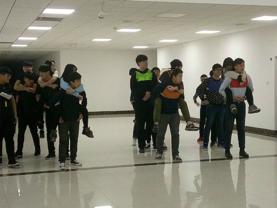 規(guī)則:每組六人,兩兩一組,背人者需要進(jìn)行接力并且開始前背人者蒙眼原地轉(zhuǎn)5圈(計(jì)時(shí)賽)
