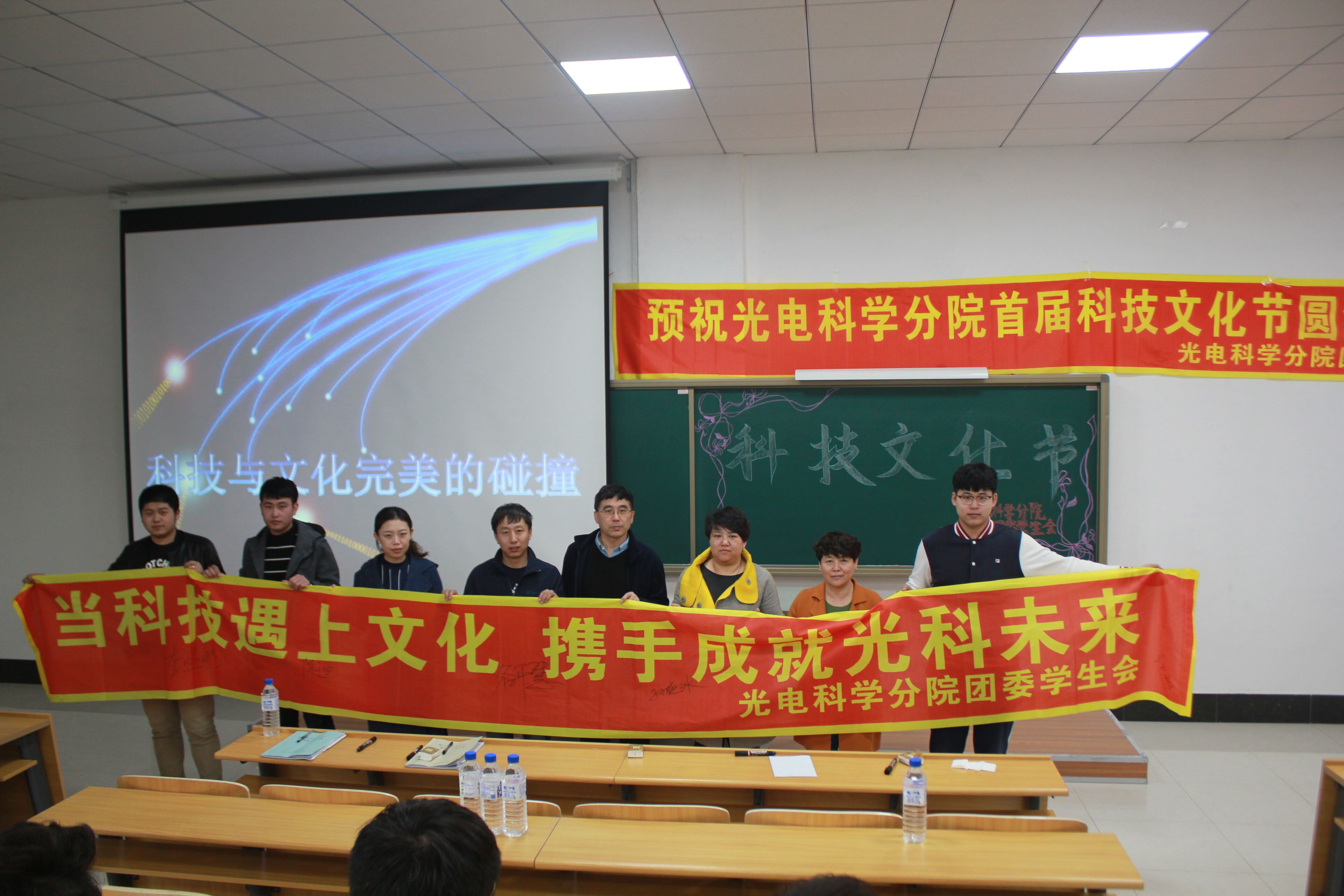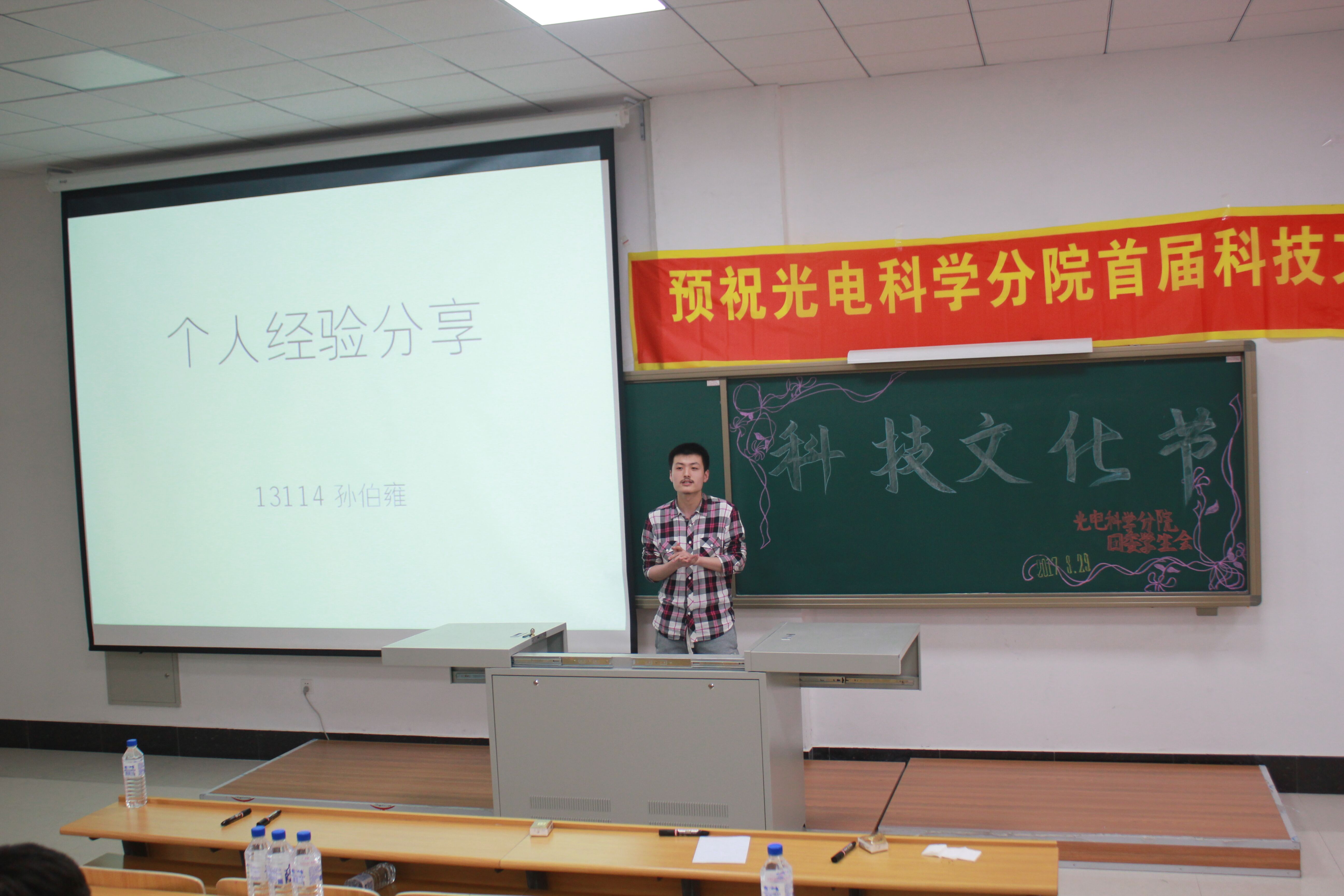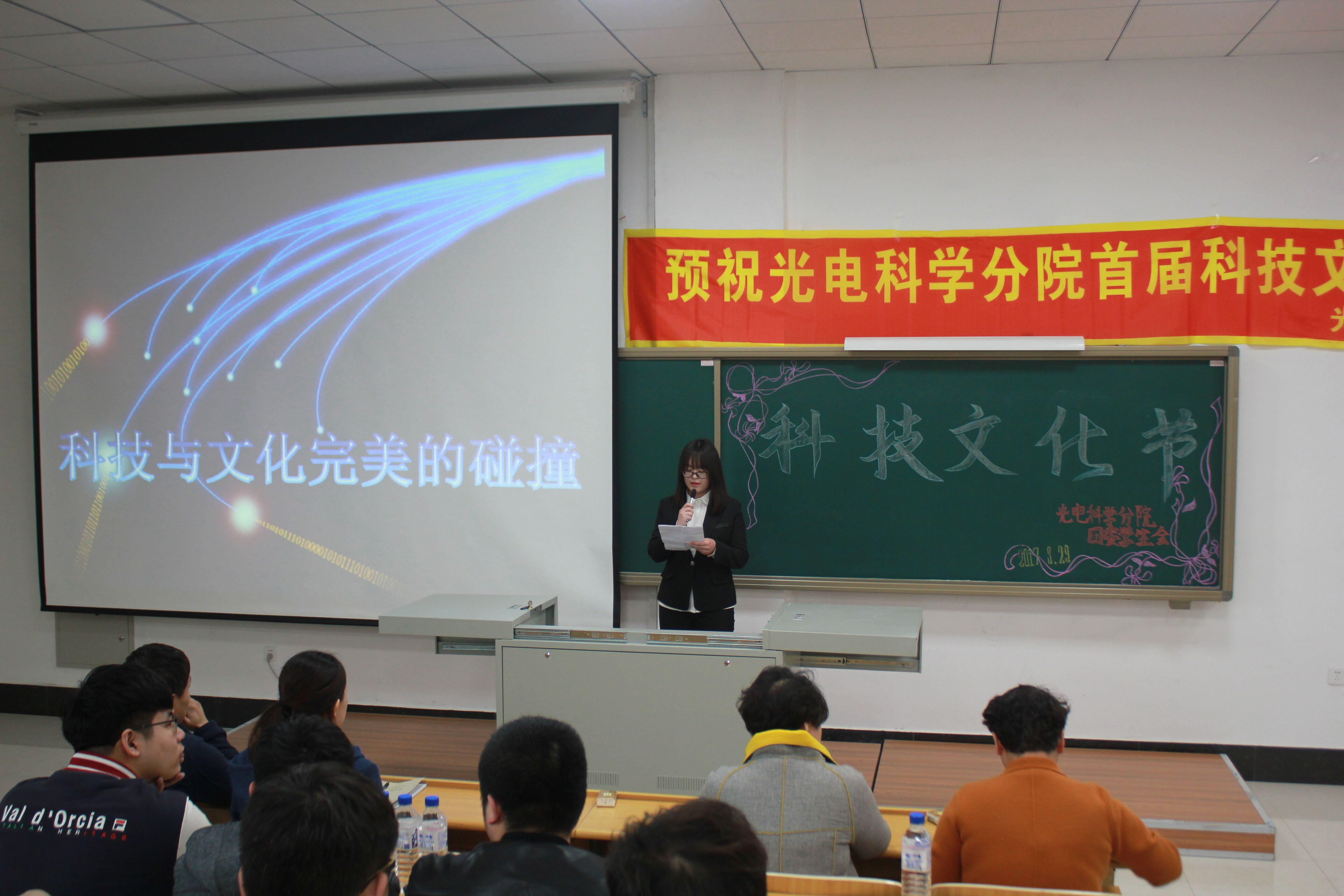 學生代表馬麗同學的精彩演講,讓我們感受到了光電科技那無限的魅力,接著領導嘉賓上臺簽字、合影留念。之后由孫伯雍學長上臺講述在光電科學分院的個人經歷,讓光科學子更加深刻的理解自己所學的專業(yè),明確以后的人生方向,最后由姚大力老師上臺點評,會上,同學們集中精力聽了這次報告,會上不時地掌聲一浪高過一浪。在今后的一學期中,科技文化節(jié)將為廣大同學帶來更多精彩的活動,為校園生活增添一份科技的生機。