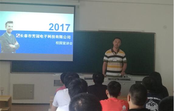 公司代表王經(jīng)理播放了企業(yè)的宣傳片,讓到場的同學(xué)們了解了芳冠電子科技有限公司的概況,從而激發(fā)同學(xué)們的興趣。接下來公司代表王經(jīng)理向同學(xué)們介紹了廠房設(shè)施、經(jīng)營范圍、主要客戶、薪資福利、晉升通道、實習(xí)崗位等信息。他表示,長春市芳冠電子科技有限公司是原國有企業(yè)吉林紫晶電子有限責(zé)任公司改制后,由骨干職工共同組建的民營公司,前身紫晶電子成立于1997年7月份,現(xiàn)公司注冊資金1028.85萬元,擁有員工300余人,是按照現(xiàn)代企業(yè)制度建立起來的生產(chǎn)液晶顯示屏和液晶顯示模塊的大型電子企業(yè),也是中國最具規(guī)模的液晶顯示器制造商。公司現(xiàn)代化廠區(qū)面積2.5萬平方米,其中4280平方米的高潔凈度生產(chǎn)車間,凈化條件居全國同行業(yè)前列。公司引進具有國際先進水平的日本全自動化LCD制造設(shè)備和工業(yè)技術(shù),具有年產(chǎn)液晶模塊2千萬塊的生產(chǎn)能力。