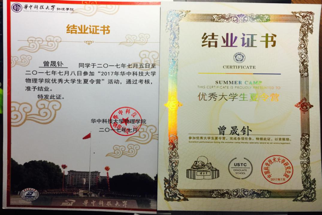 在7月5日至7月8日,曾晟釙同學(xué)參加了華中科技大學(xué)物理學(xué)院的夏令營(yíng)。在這短短的4天時(shí)間里,他不僅收獲了知識(shí),開拓了視野,更與其它高校的營(yíng)員們建立了深厚的友誼;在7月17日至7月21日,曾晟釙同學(xué)參加了中國(guó)科學(xué)技術(shù)大學(xué)夏令營(yíng)物理分營(yíng)。本次夏令營(yíng)內(nèi)容包括營(yíng)員報(bào)到、開營(yíng)儀式、專題講座、參觀實(shí)驗(yàn)室、素質(zhì)拓展、面試、閉營(yíng)儀式等環(huán)節(jié),曾晟釙同學(xué)十分投入地參與各項(xiàng)活動(dòng),認(rèn)真聽講、深入思考、積極發(fā)言。值得一提的是,面試環(huán)節(jié)中,他腳踏實(shí)地、刻苦鉆研的精神得到了幾位面試官的一致好評(píng),展現(xiàn)了我院學(xué)子積極向上的態(tài)度和良好的精神風(fēng)貌,最終順利結(jié)業(yè)。