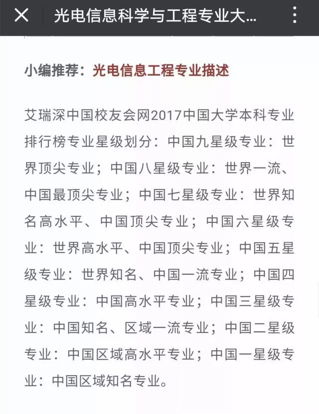 目前,根據(jù)艾瑞深中國校友會最新公布的2017中國大學(xué)本科專業(yè)排行榜,長春理工大學(xué)光電信息學(xué)院(以下簡稱:光電信息學(xué)院)“光電信息科學(xué)與工程專業(yè)”屬于世界高水平、中國頂尖專業(yè),專業(yè)星級6星(全國達(dá)到6星級以上公辦高校只有7所),位列全國獨(dú)立院校專業(yè)榜首。