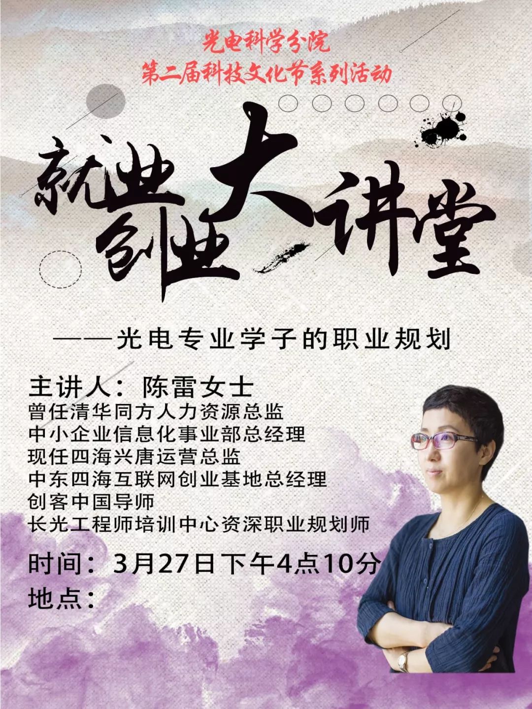 本次講座的主題是——光電專業(yè)學(xué)子的職業(yè)規(guī)劃【有能力奢侈糜爛or 只能茍且】。分院有幸邀請到中東四海互聯(lián)網(wǎng)+創(chuàng)業(yè)基地導(dǎo)師,四海興唐教育科技集團(tuán)創(chuàng)始人、運(yùn)營總監(jiān)陳雷女士。
