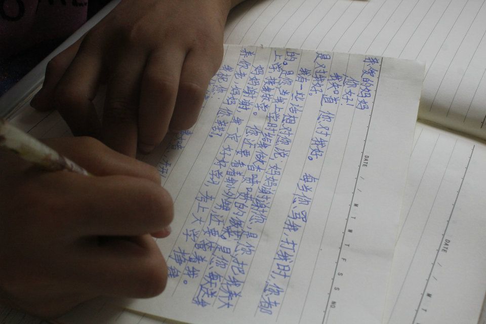 下午的致家長一封信活動按計劃進行。雖然每天孩子們都在跑著鬧著,看起來無憂無慮,學(xué)校的每一個角落都充滿了他們的歡聲笑語。但其實在孩子們的心里都有很多想多父母說但是很少有機會或是羞于說出口的話。有些孩子的父母分居兩地,終年相聚僅一兩次;有些孩子的父母疏于對孩子管教,總在吵架打牌,讓孩子有話難說。所以我們通過讓孩子給父母寫一封信這樣的方式使他們的父母聽到自己孩子的心聲,知道孩子對他們那最純真樸實的愛。