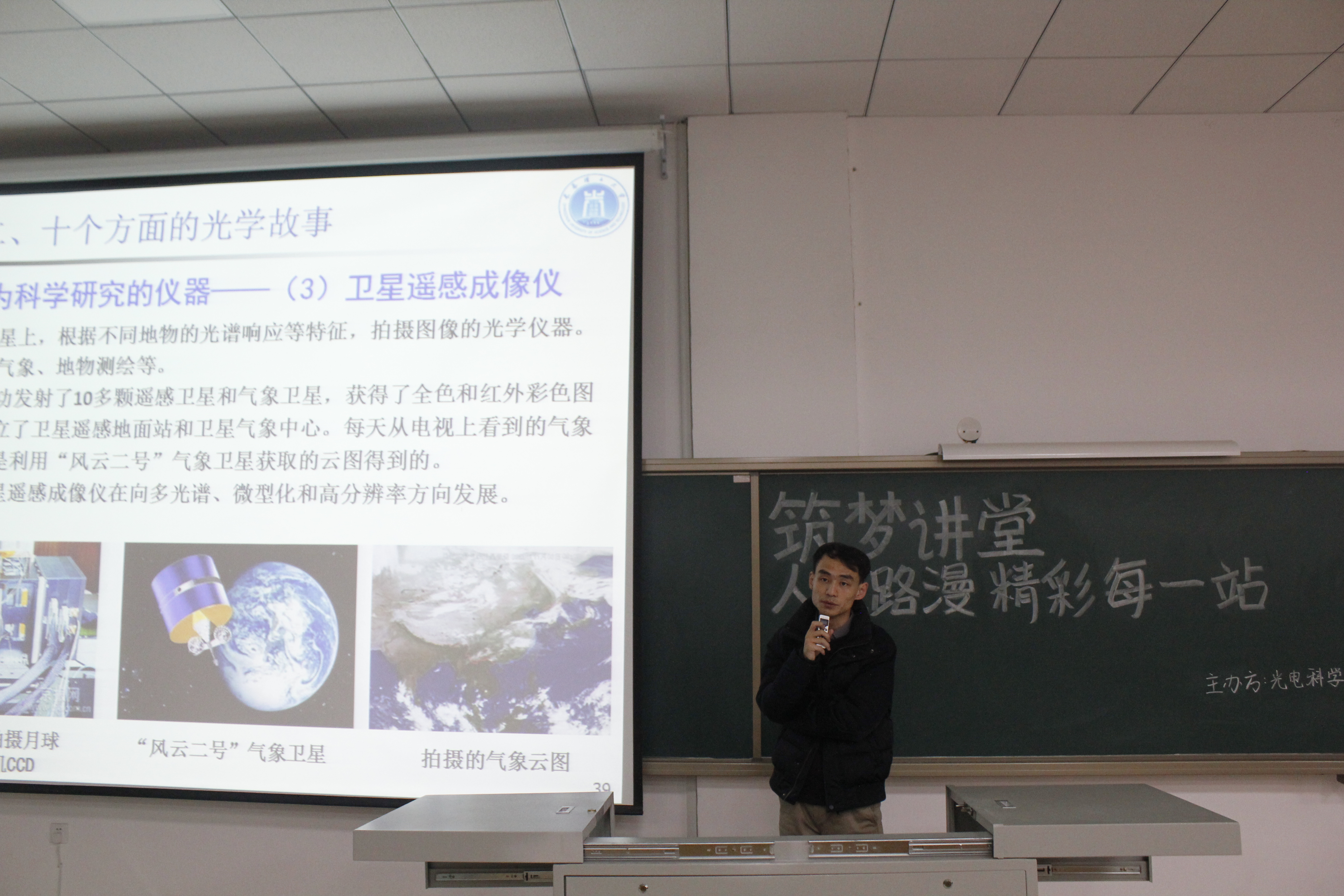 講座開(kāi)始,李楊老師為同學(xué)們簡(jiǎn)要介紹了兩位博士的研究方向及學(xué)習(xí)經(jīng)歷。隨后,韓龍博士向在座大學(xué)生講述了光學(xué)的科學(xué)地位、發(fā)展歷程以及趙昭等多位優(yōu)秀學(xué)生代表。而后劉顯著博士向觀眾們介紹了光學(xué)的發(fā)展方向,為同學(xué)們展現(xiàn)了自己學(xué)科的廣闊前景,鼓勵(lì)同學(xué)們?cè)诒緦W(xué)科的基礎(chǔ)和專業(yè)知識(shí)上加強(qiáng)學(xué)習(xí),在光學(xué)的發(fā)展道路上更進(jìn)一步,為構(gòu)筑人生夢(mèng)、中國(guó)夢(mèng)貢獻(xiàn)力量。在講座的最后,李楊老師表達(dá)了自己對(duì)同學(xué)們的殷切期盼,并祝愿大家像劉顯著學(xué)長(zhǎng)一樣,擁有一個(gè)光明、廣闊、遠(yuǎn)大的前程。