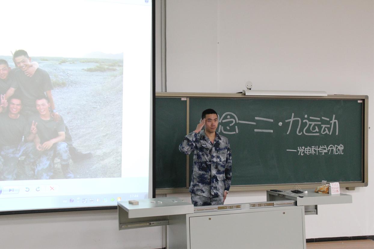 此次活動(dòng)由參軍退役的張瀚文同學(xué)(曾服役于武警雪豹突擊隊(duì))組織光電科學(xué)分院六名退伍軍人分享了軍營(yíng)生活及入伍感想。通過(guò)他們講述的訓(xùn)練過(guò)程以及視頻和圖片,讓我們了解到軍人的使命感與責(zé)任感。