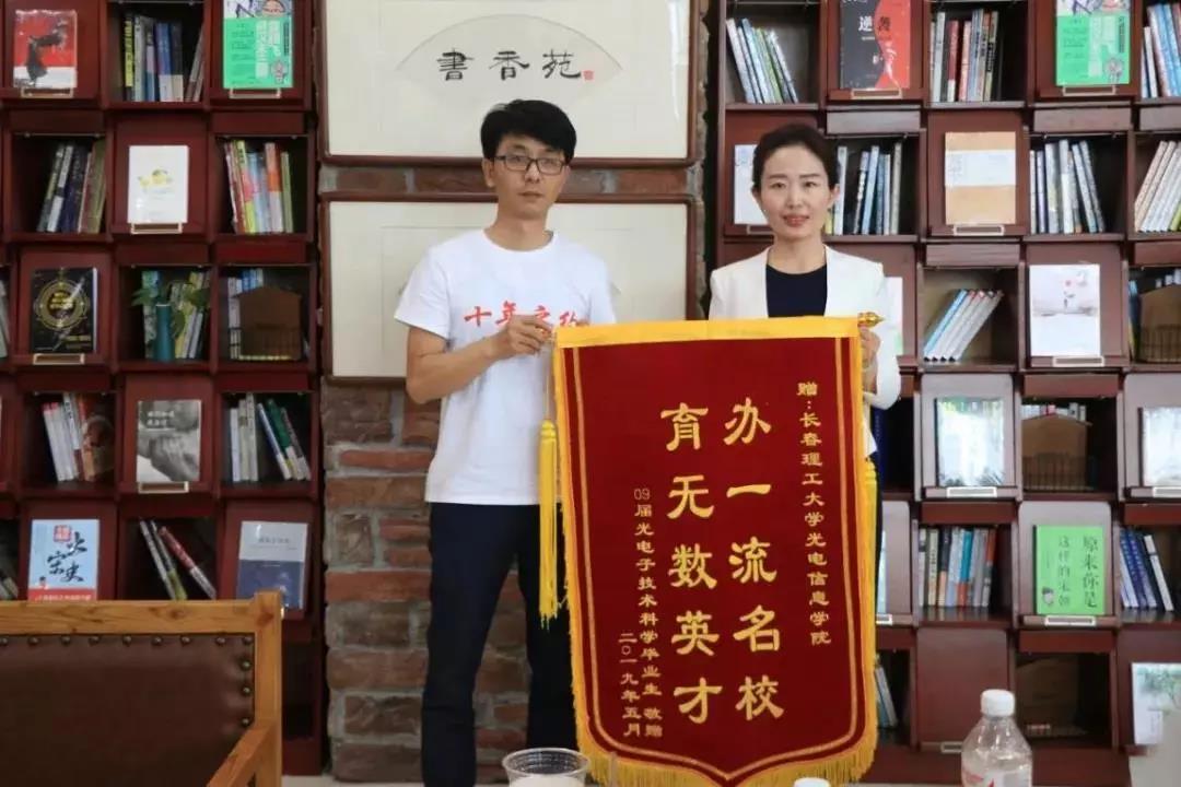 負(fù)責(zé)校友會(huì)工作的學(xué)生處處長(zhǎng)鞠秀晶老師代表學(xué)院歡迎校友十年后再回母校,共敘當(dāng)年情,并祝愿校友們工作順利、生活美滿。鞠處長(zhǎng)介紹了學(xué)校校友工作的相關(guān)情況,就學(xué)院近年來(lái)的發(fā)展向各位校友進(jìn)行了介紹,并為每位校友送上學(xué)院的紀(jì)念品。校友們熱血沸騰,對(duì)學(xué)院所取得的成績(jī)報(bào)以最熱烈的掌聲,為母校深感光榮與自豪。光電科學(xué)分院院長(zhǎng)谷開(kāi)慧、光電工程分院院長(zhǎng)孫曉冰、光電科學(xué)分院副院長(zhǎng)李楊跟校友們親切交談,大家都感慨:無(wú)論校友們們身在何處,從事何種職業(yè),擔(dān)任何種職務(wù),都是老師和母校心愛(ài)的學(xué)生,母校永遠(yuǎn)以你們?yōu)闃s。鞠處長(zhǎng)代表學(xué)院接下來(lái)校友們送來(lái)的錦旗。