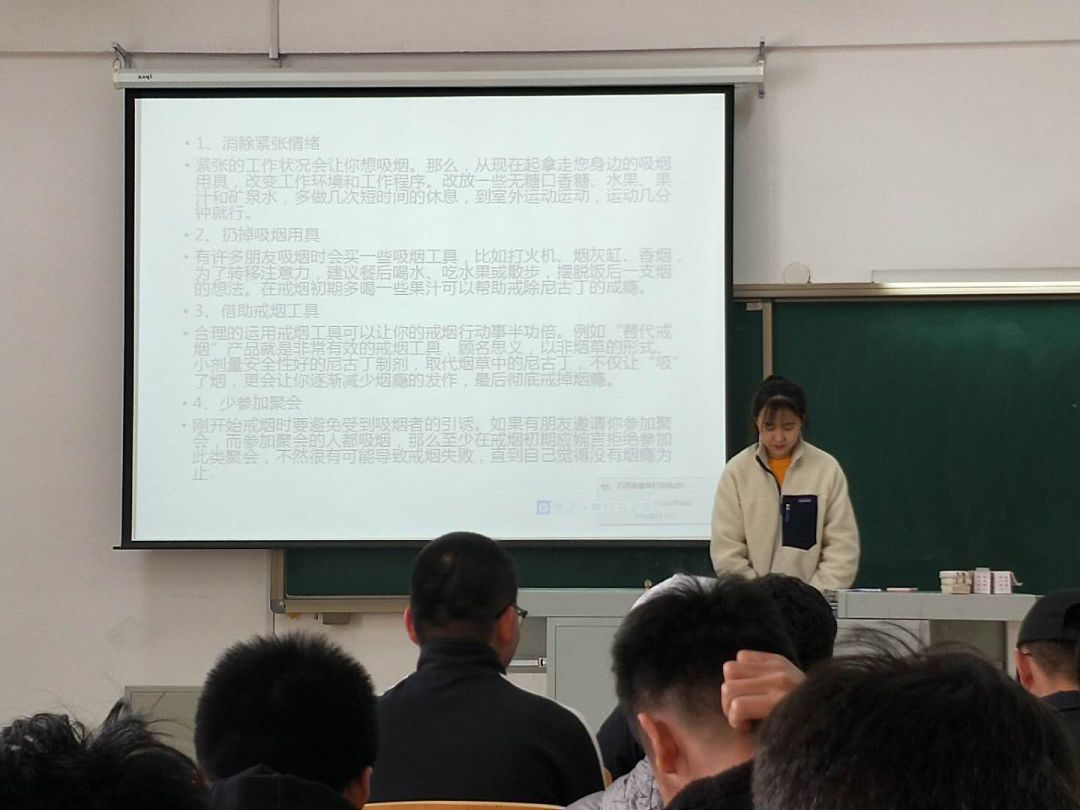 同學們的闡述過后,團支書總結了吸煙對健康的危害,還有二手煙的進一步危害。曾經有過吸煙經歷的同學,也誠懇地分享自己的往事,以此警戒大家。團支書希望沒有煙癮的同學不要碰煙,有煙癮的同學,能夠盡量戒煙。