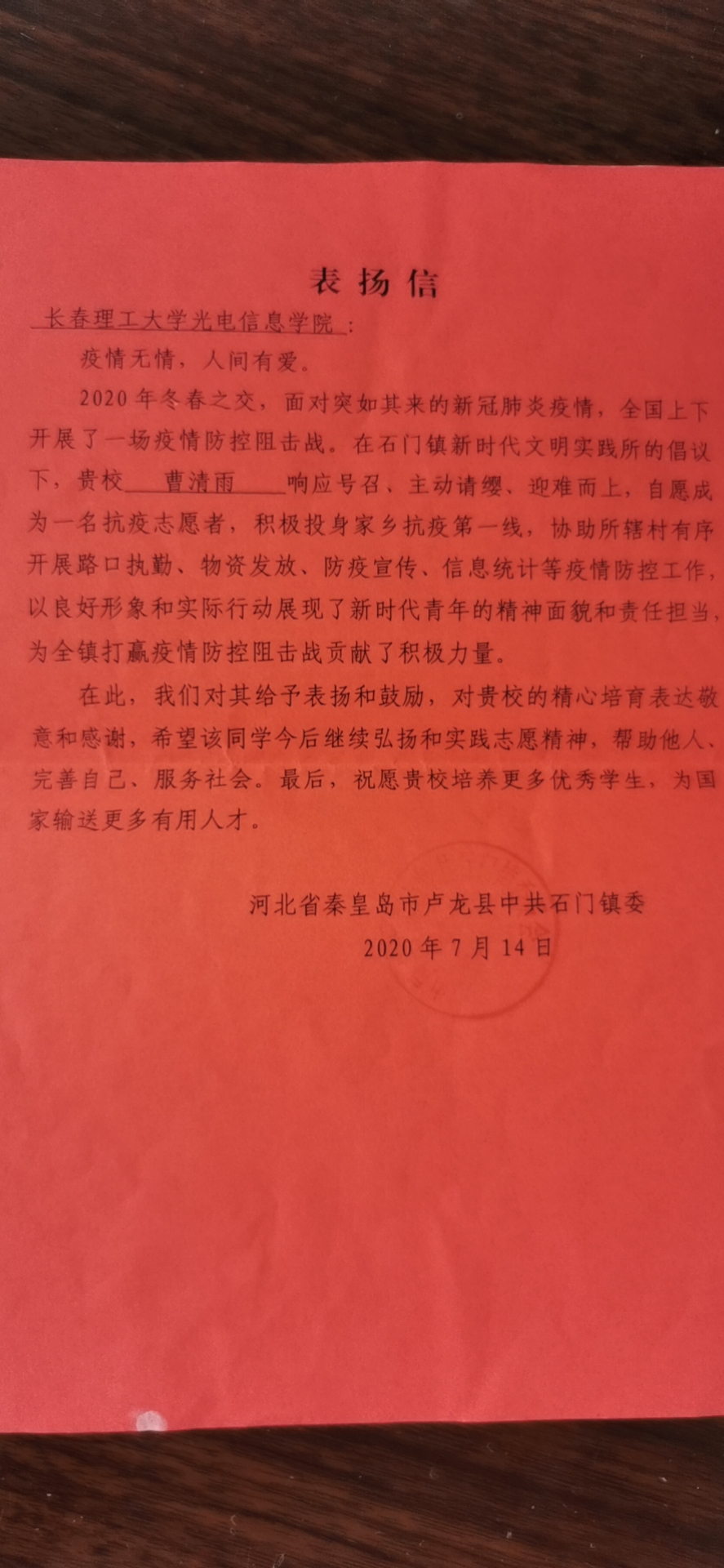 近日,長春理工大學(xué)光電信息學(xué)院收到了來自河北省秦皇島市盧龍縣中共石門鎮(zhèn)委對(duì)光電科學(xué)學(xué)院18級(jí)1812101曹清雨同學(xué)參與抗擊疫情志愿服務(wù)的表揚(yáng)信。