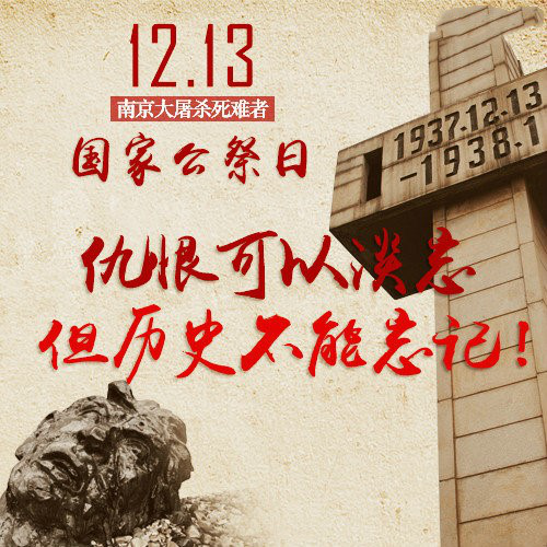 2014年2月27日,第十二屆全國人大常委會第七次會議通過決定,將每年的12月13日設(shè)立為南京大屠殺死難者國家公祭日。決議的通過,使得對南京大屠殺遇難者的紀(jì)念上升為國家層面,表明了中國人民反對侵略戰(zhàn)爭、捍衛(wèi)人類尊嚴(yán)、維護世界和平的堅定立場。