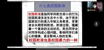 本次線上會(huì)議包括防校園欺凌、防意外傷害、防火災(zāi)三方面。其中,針對(duì)校園欺凌的實(shí)際情況,主講人耐心向同學(xué)們闡述其本質(zhì)及產(chǎn)生原因。并著重強(qiáng)調(diào)校園欺凌作為校園暴力的一種,具有嚴(yán)重危害性,校園欺凌會(huì)對(duì)同學(xué)構(gòu)成心理問題,更有甚者,還會(huì)對(duì)其人格發(fā)展造成不良影響。