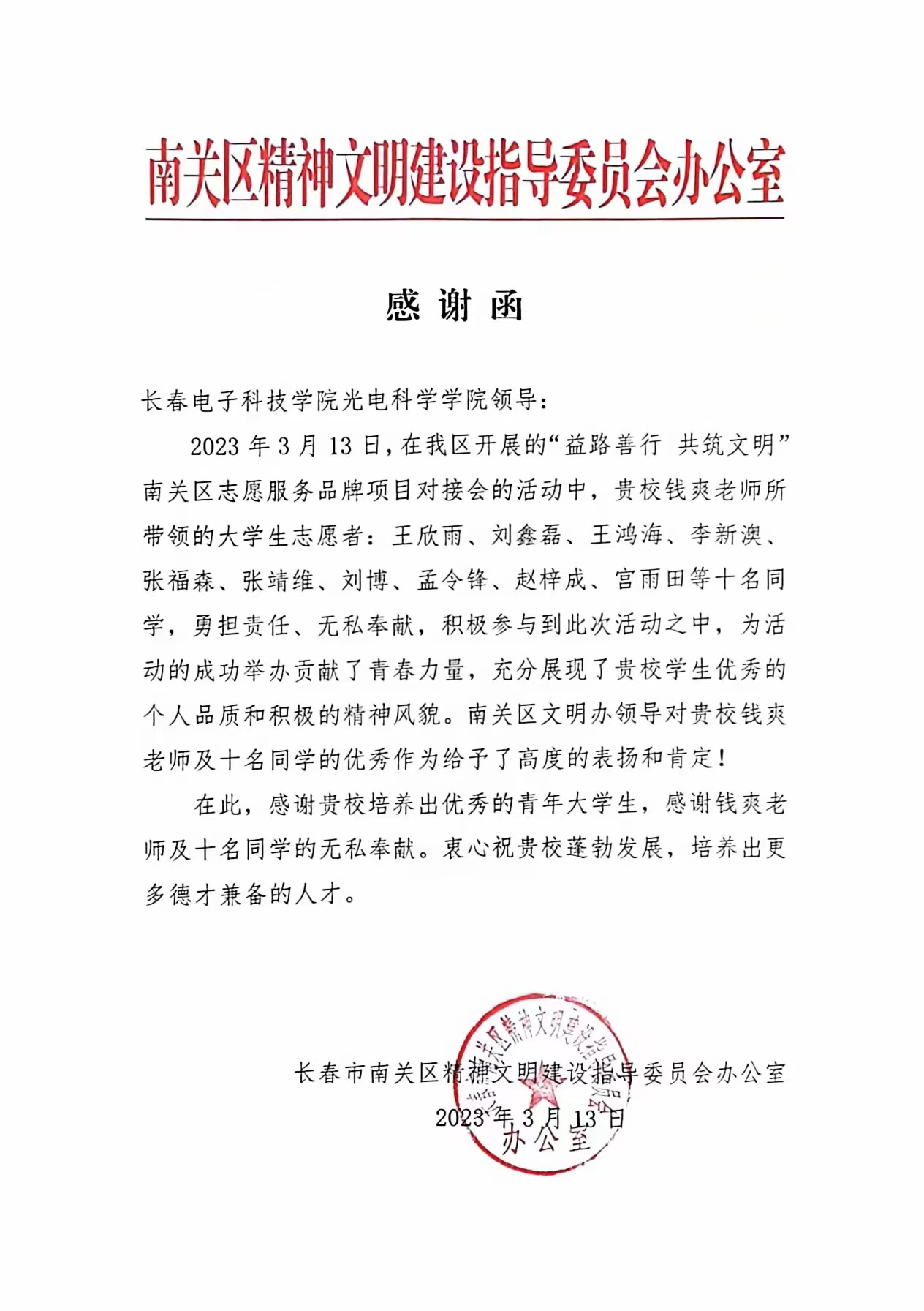 同學(xué)們身穿紅色馬甲,佩戴“長春電子科技學(xué)院”的?;眨粋€(gè)個(gè)忙碌的身影穿梭在此次志愿服務(wù)活動中,他們以高度的社會責(zé)任感、昂揚(yáng)的精神面貌展現(xiàn)了長電學(xué)子的風(fēng)采,用行動詮釋了作為新時(shí)代青年的責(zé)任與態(tài)度,受到了來自南關(guān)區(qū)文明辦的高度表揚(yáng)和感謝。