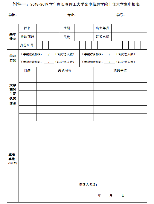 三、完成附件中的“2018-2019學年度十佳大學生申報表”,并上交一份不少于800字的事跡材料,事跡材料模板的(附件三,標題為二號黑體字,正文為宋體小四號字,可添加照片)內(nèi)容僅供參考。請于6月30日前將電子版的申報表、事跡材料、獲獎證明圖片與本人生活照一張,以學院為單位發(fā)送至學生處崔明宇老師的郵箱554314224@qq.com 。