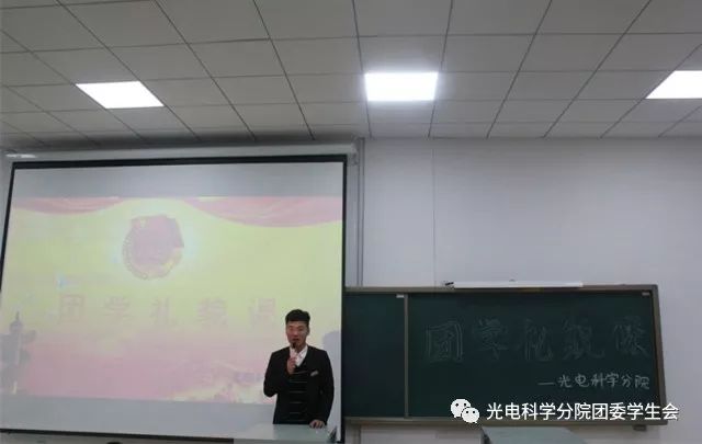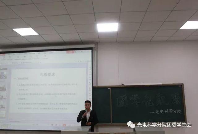為弘揚(yáng)十九大精神,增強(qiáng)同學(xué)們的組織性和紀(jì)律性,光電科學(xué)分院團(tuán)委學(xué)生會(huì)組織部于10月24日下午五點(diǎn)半在西階201開展了團(tuán)學(xué)禮貌課。學(xué)生會(huì)全體成員參加了此次課程。