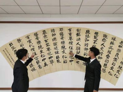 書法是我國悠久的傳統(tǒng)文化,同學們進入書藝苑后在作品前駐足觀看,品讀每一幅作品中所體現(xiàn)的精神和其中所蘊含的文化。作品筆法強勁有力,給人筆走龍蛇之感,讓同學們感到中華民族書法文化的魅力所在。同學們看完一幅又一幅作品,留下的只有一句又一句的贊美之詞,尤其是看到近十米長的一幅作品以及一副扇形作品時,每個人心里更是發(fā)出一句句感慨之詞。