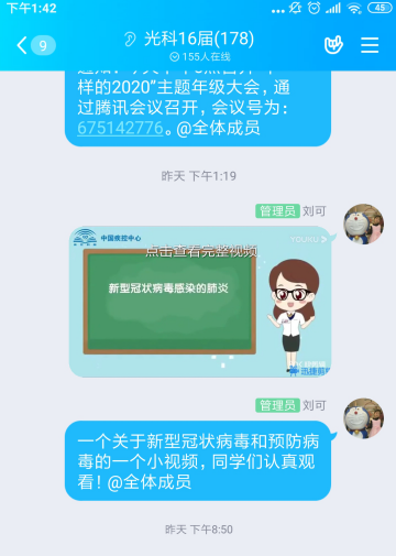 最后劉老師強調(diào)了學(xué)校在疫情期間的規(guī)章制度,同學(xué)們必須牢牢遵守。劉老師還在年級QQ群眾發(fā)布了關(guān)于預(yù)防新冠肺炎小知識的視頻,同學(xué)們自行觀看。