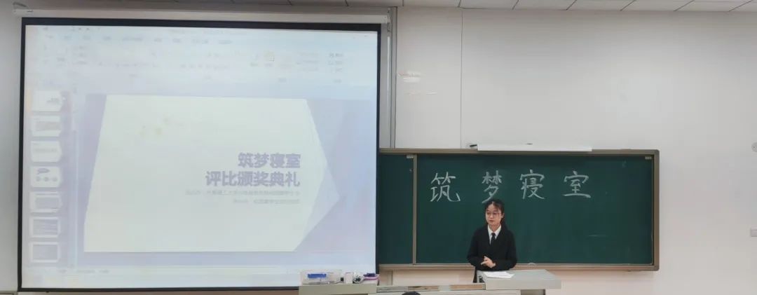 頒獎典禮上,主持人介紹本次筑夢活動的意義,比賽內(nèi)容和評比規(guī)則以及一個優(yōu)良的寢室氛圍對當(dāng)代大學(xué)生校園生活所具有的重要性。