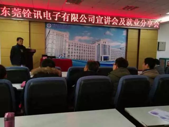 遵循職業(yè)方向,助力發(fā)展成長。12月2日9:00,東莞銓訊電子有限公司在我院達新校區(qū)舉行了實習就業(yè)宣講會和招聘會。此次宣講會邀請到臺灣佳能企業(yè)股份公司高管呂學萬處長擔任主講人。參與此次宣講會的還有東莞銓訊電子有限公司就業(yè)指導處蔡政勳經理,李俊蔚副經理,萬國輝課長,人力資員處李卿如女士,翟羽佳女士。光電科學分院副院長李楊老師,光電科學分院輔導員陳迪老師及2018屆應屆畢業(yè)生。會上,呂處長做了精彩宣講,從公司背景、組織結構、企業(yè)文化、福利待遇、人力資源政策及實習生職業(yè)發(fā)展途徑等方面做了具體介紹。同時,分享了自己二十年來就業(yè)經驗,在宣講結束后熱情的為同學們答疑。蔡經理和萬科長分別介紹了自己的專業(yè)領域,蔡經理還向同學們分享了自己的大學時光及求職經歷,強調應該用發(fā)展的眼光看問題,把個人的優(yōu)勢和特長發(fā)揮出來,加強對企業(yè)的觀察同時提升自己的綜合素質綜合修養(yǎng)與綜合能力,融入社會的同時提高個人交往能力。