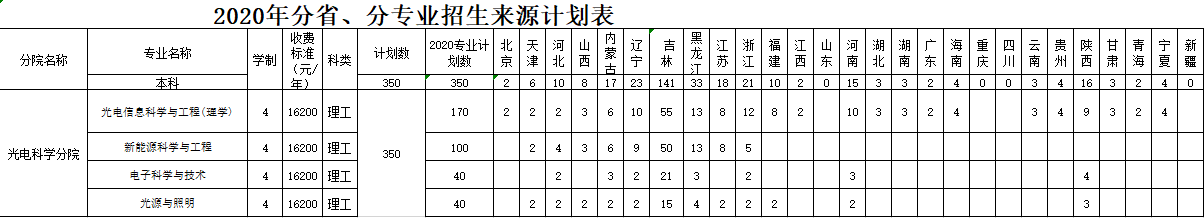 2020年分省、分專業(yè)招生來源計劃表