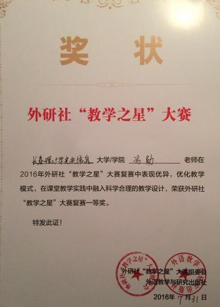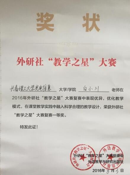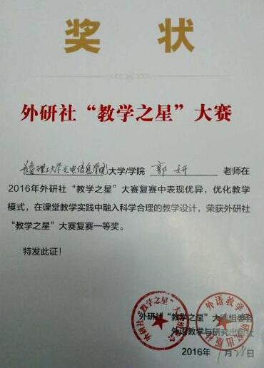 于2016年8月三位教師在南京市參加了由外研社舉辦的微課 “教學(xué)之星”大賽。我院基礎(chǔ)教學(xué)部白小川、馮勛和郭妍三位教師憑借出色的微課設(shè)計能力、思辨能力、臨場應(yīng)變能力和扎實(shí)的語言基本功,獲得外研社“教學(xué)之星”大賽復(fù)賽一等獎。