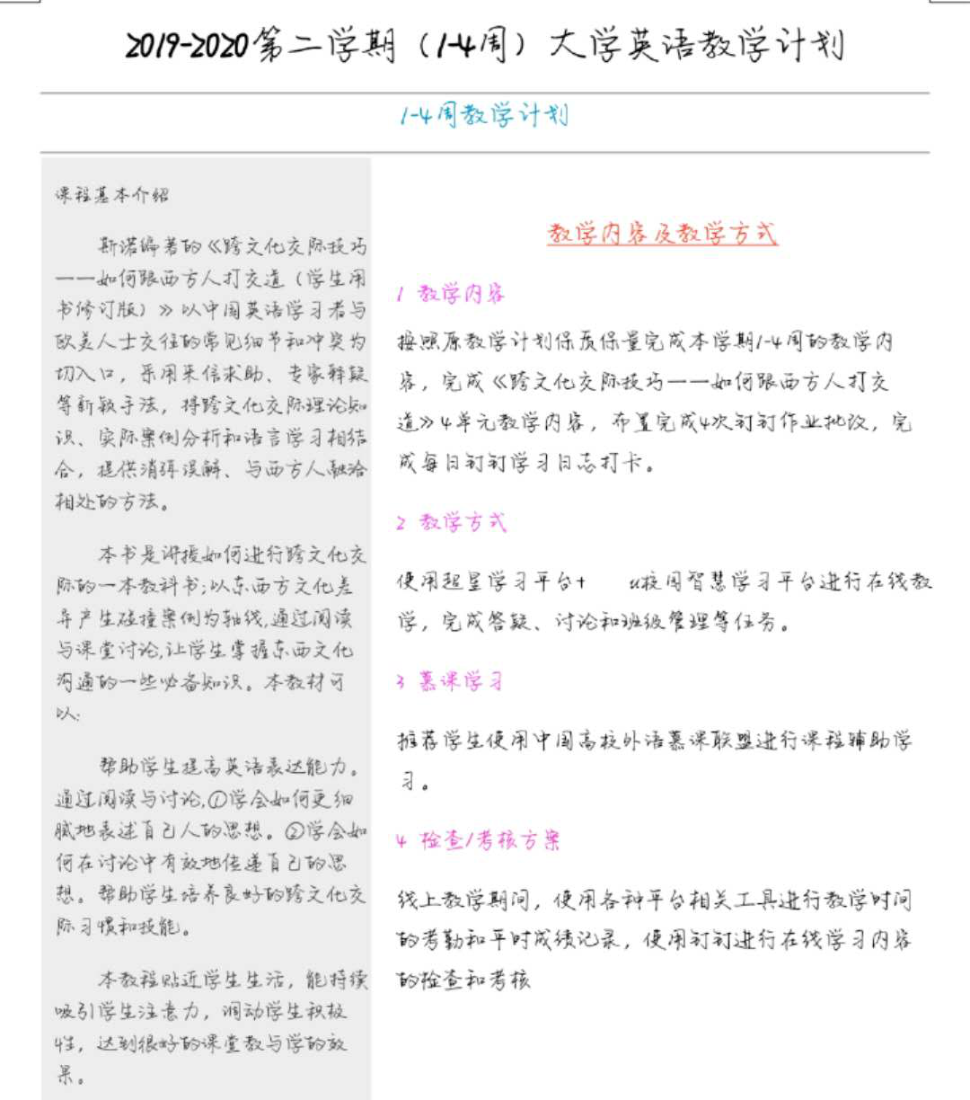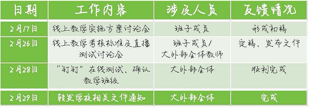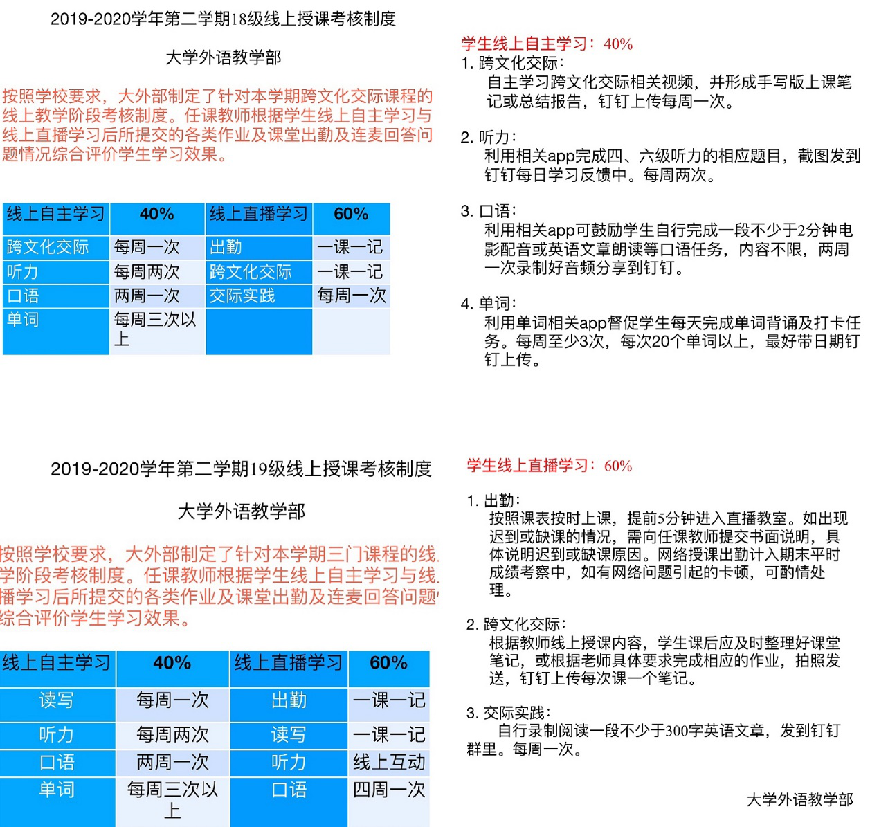 形成了《大學外語教學部2019-2020學年第二學期線上教學指導方案》和《大學外語教學部2019-2020學年第二學期線上教學考核標準》。要求每位任課教師按照文件要求完成線上教學直播測試,備課時做到一課一案、一生一案,確保授課質量。各項方案的制定是為教師提供更好的教學設計參考,幫助教師引導學生精準學習,切實解決教師在線教學所需。