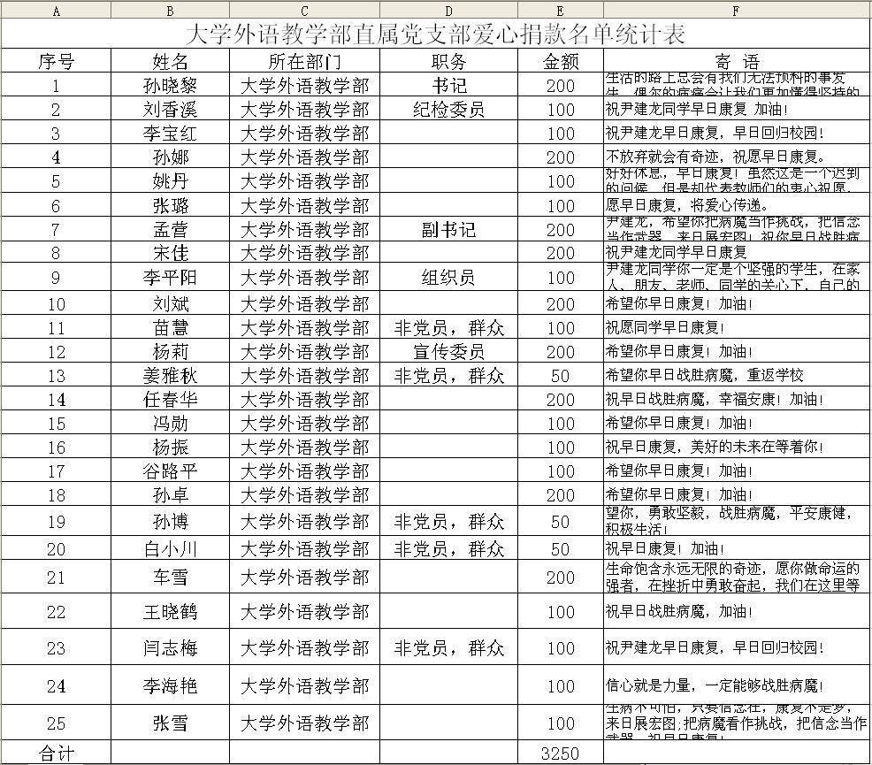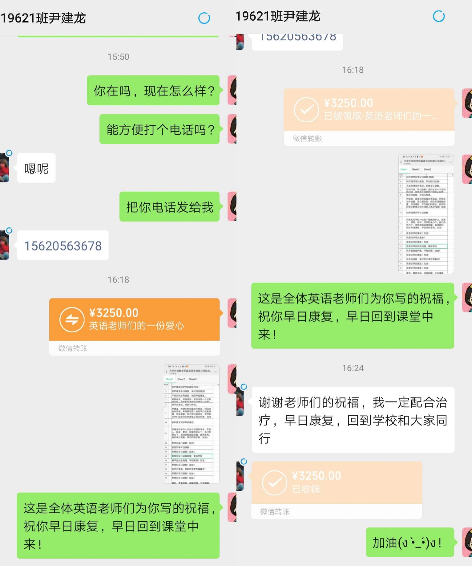 大學(xué)外語黨支部在得知這一情況后,于2020年5月7日發(fā)出愛心捐款倡議書,為身患重病的尹建龍同學(xué)奉獻(xiàn)一份愛心,活動得到了大學(xué)外語全體教師的積極響應(yīng)和廣泛參與。5月8日,25名教師紛紛獻(xiàn)出愛心,共捐得善款3250元,并寫下了對尹建龍同學(xué)真摯的祝福。