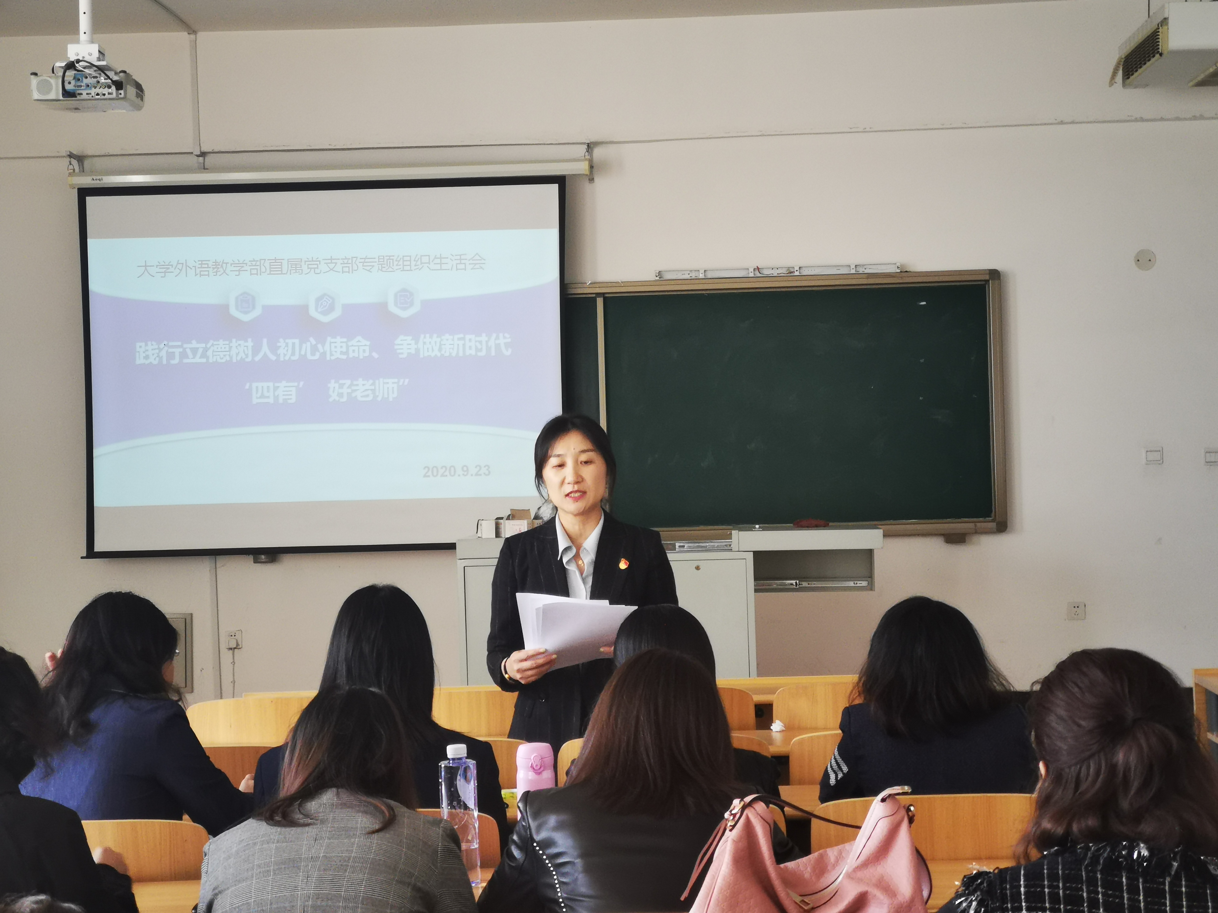 按照學(xué)院黨委工作部署要求, 9月23日下午大學(xué)外語(yǔ)直屬黨支部在東教205室召開(kāi)了主題為“踐行立德樹(shù)人初心使命、爭(zhēng)做新時(shí)代‘四有’好老師”組織生活會(huì),支部全體黨員同志參加了大會(huì)。