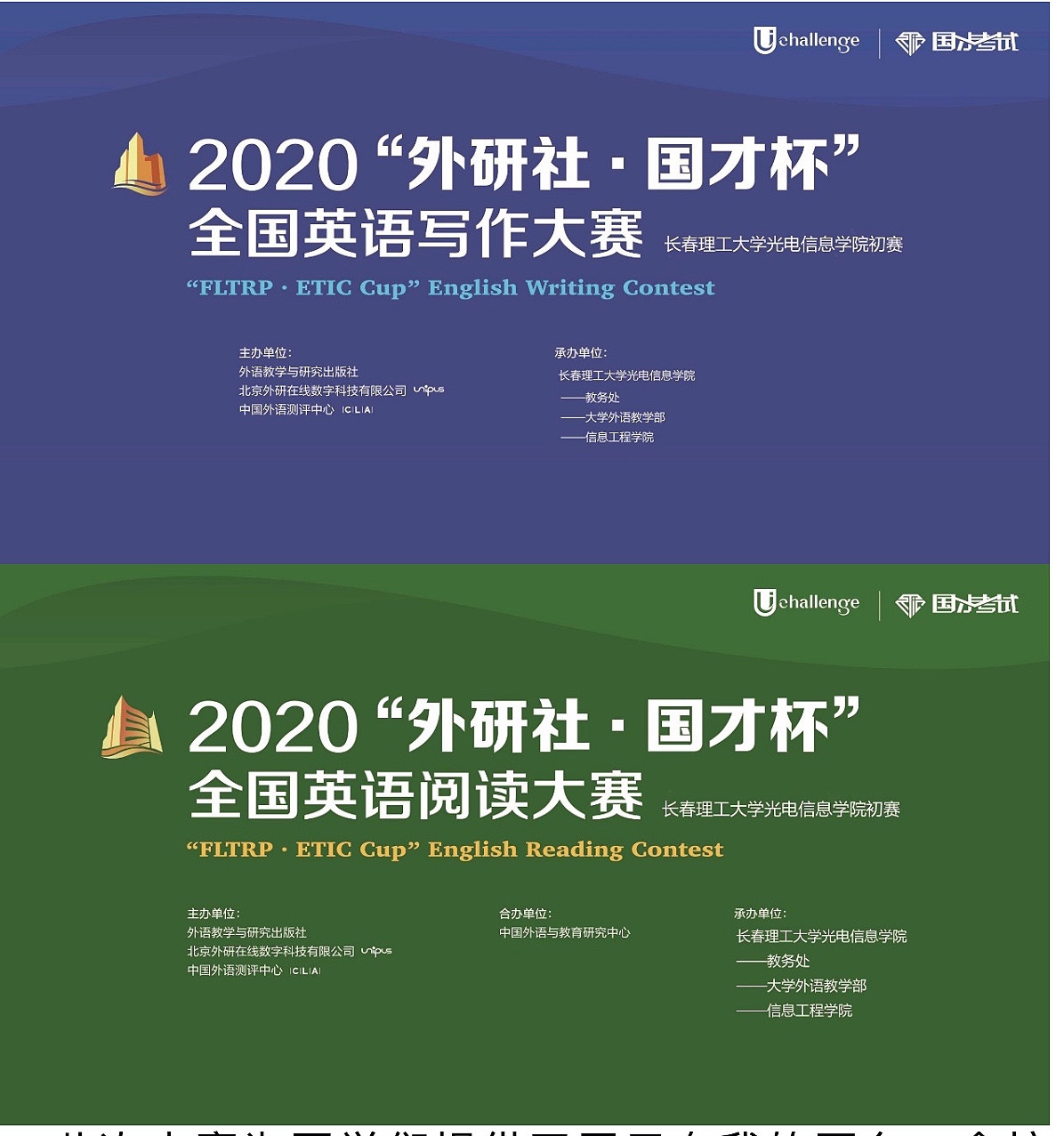 由我校大學(xué)外語(yǔ)教學(xué)部承辦的“2020‘外研社?國(guó)才杯’全國(guó)英語(yǔ)寫作大賽、全國(guó)英語(yǔ)閱讀大賽“——長(zhǎng)春理工大學(xué)光電信息學(xué)院校級(jí)決賽圓滿結(jié)束。