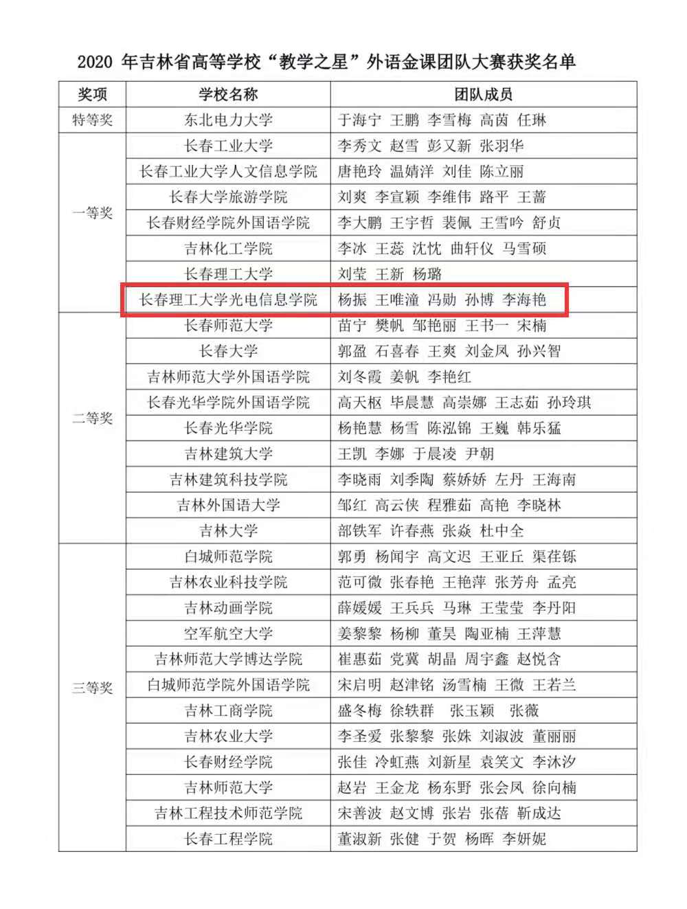 11月23日,2020年吉林省高等學校“教學之星”外語金課團隊大賽獲獎名單發(fā)布,由我校大學外語教學部教師:楊振、王唯潼、馮勛、孫博、李海艷五位教師組成的教學團隊在比賽中發(fā)揮出色,榮獲吉林省一等獎。