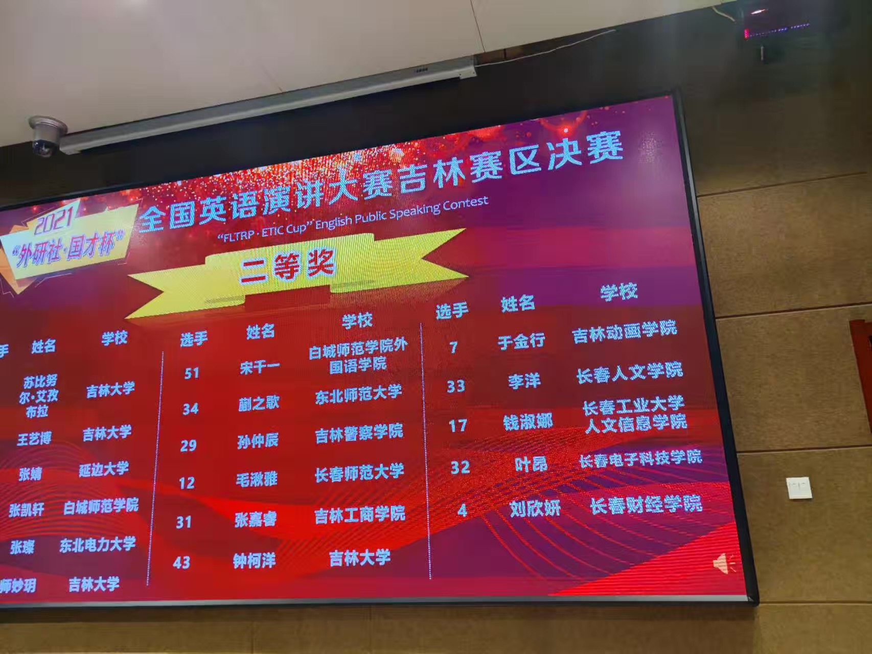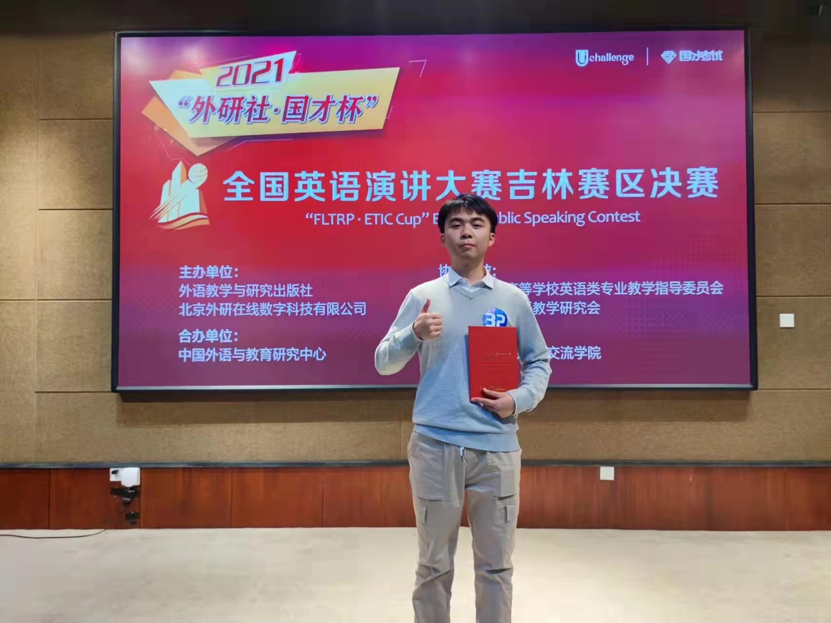 由外語教學(xué)研究出版社、北京外研在線數(shù)字有限公司主辦、中國外語與教育研究中心合辦、吉林省普通高等學(xué)校英語類專業(yè)教學(xué)指導(dǎo)委員會和吉林省大學(xué)外語教學(xué)研究會聯(lián)合協(xié)辦的2021年“外研社.國才杯”全國英語演講大賽吉林賽區(qū)決賽圓滿落幕。我校大學(xué)外語教學(xué)部孫博老師指導(dǎo)的學(xué)生葉昂在此次比賽中榮獲了吉林賽區(qū)二等獎。