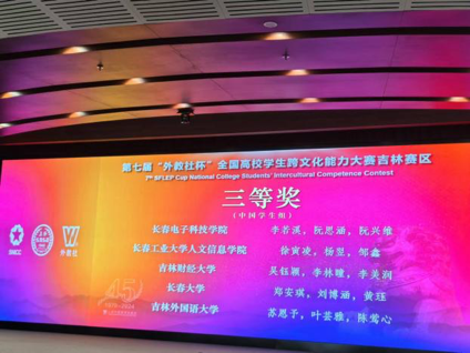 11月9日,第七屆“外教社杯”全國高校學(xué)生跨文化能力大賽吉林賽區(qū)在東北師范大學(xué)惟真樓落下帷幕。我校學(xué)生參賽并取得吉林賽區(qū)三等獎(jiǎng)的好成績。